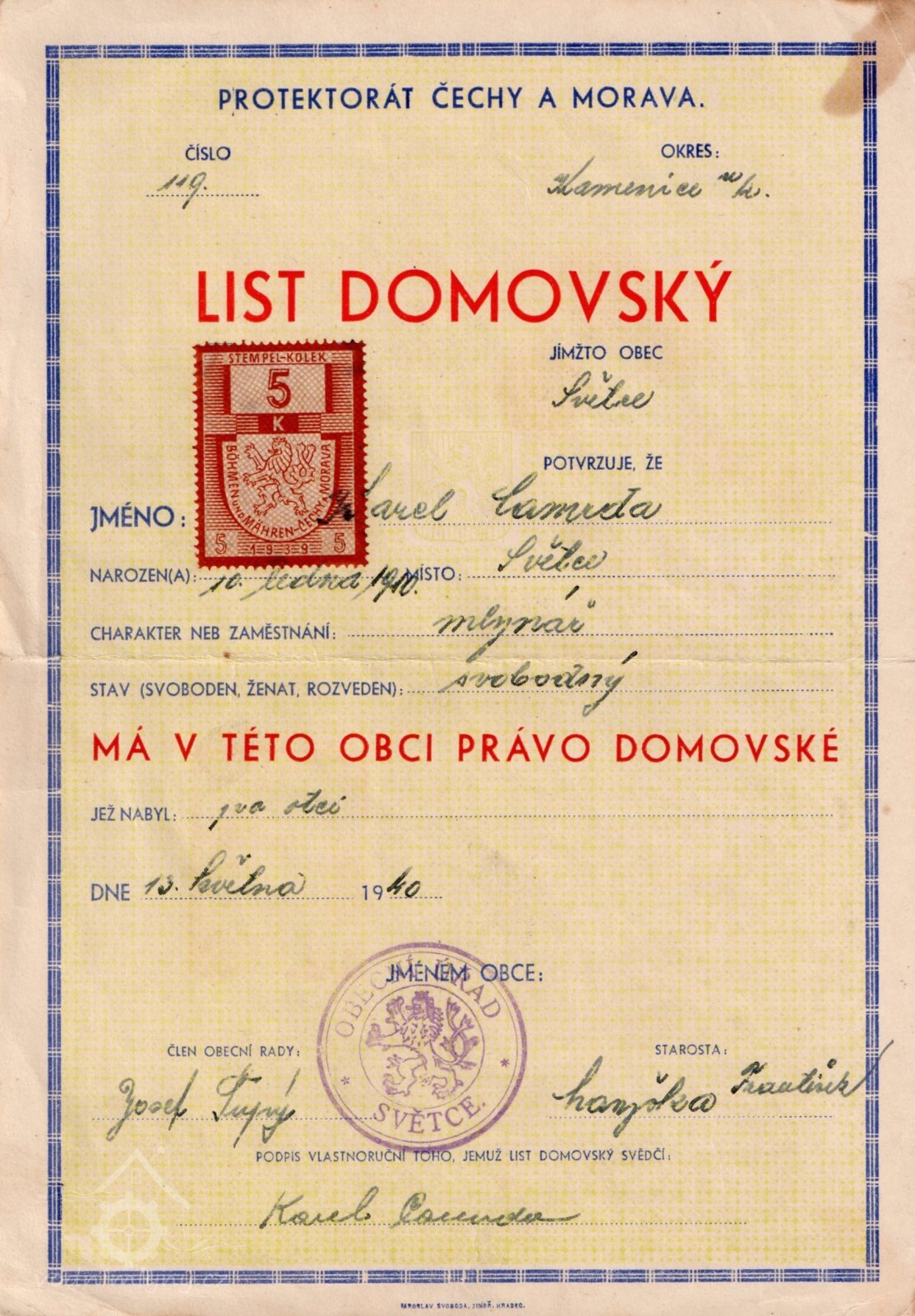 - Karel, mlynář, pilař, truhlář, *1910 ve Světcích