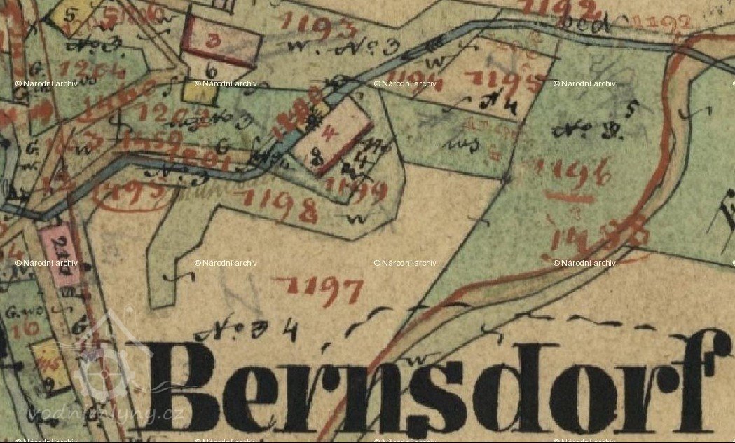 Tento mlýn (před stavbou Rauchova mlýna - Rauchmühle) byl v Bernarticích u Trutnova jediným mlýnem a sloužil k mletí obilí. V Urbarium des Guetts Schatzler, renouiret vndt vermehret (Anno 1647), v překladu Urbář statku Žacléř, obnoven a doplněn (z roku 1647) je uvedeno, že na žacléřském panství bylo tehdy pět mlýnů, z nich měl mlýn v Bernarticích 2 kola a mlel (nejspíš ročně) 60 strychů obilí. Uvedený urbář byl převzat do knihy: PRÄTORIUS, Karl, WEBER, Hellmut, Schatzlar - eine sudetendeutsche Stadt im böhmischen Riesengebirge und die Bezirksgemeinden, Marburg/Lahn 1993. (Ing. Günter Fiedler)