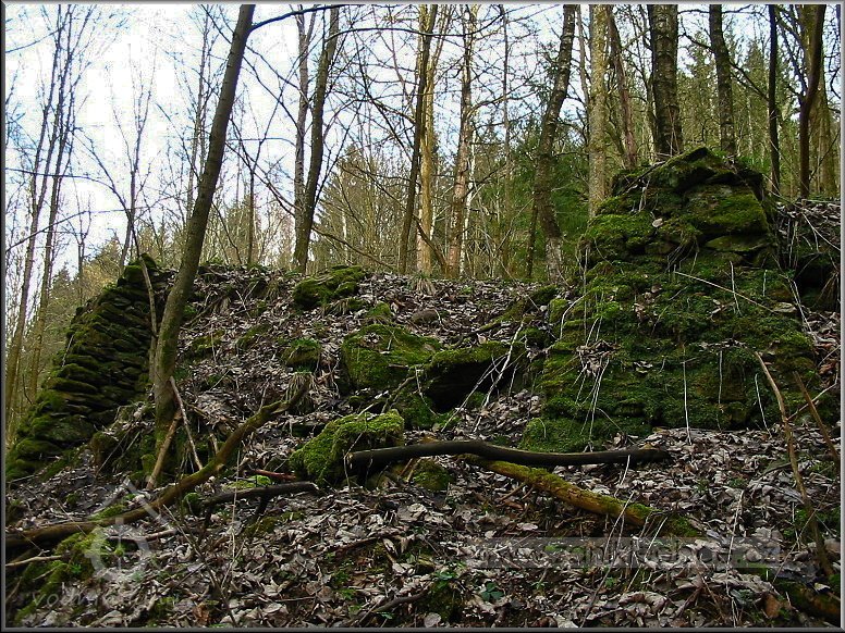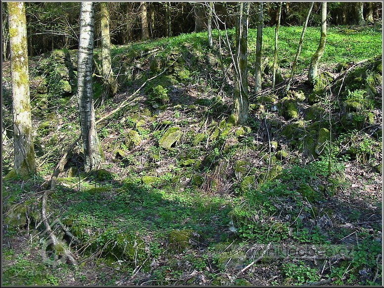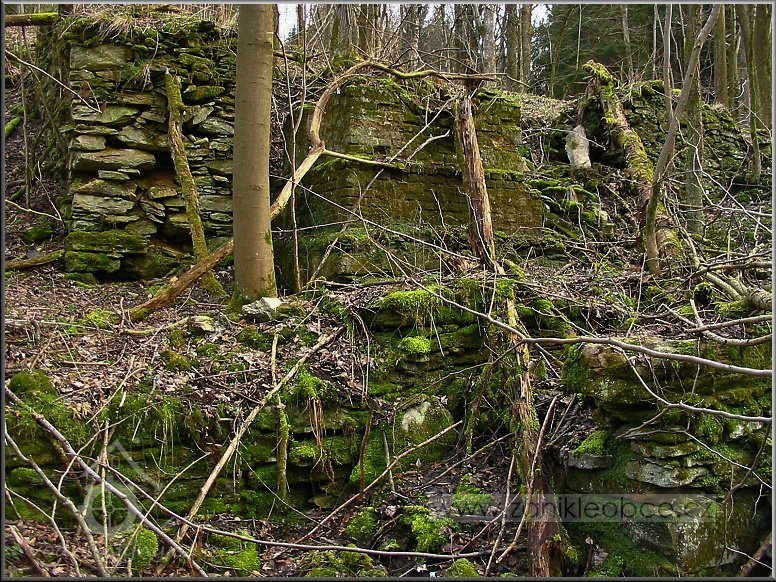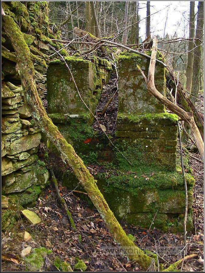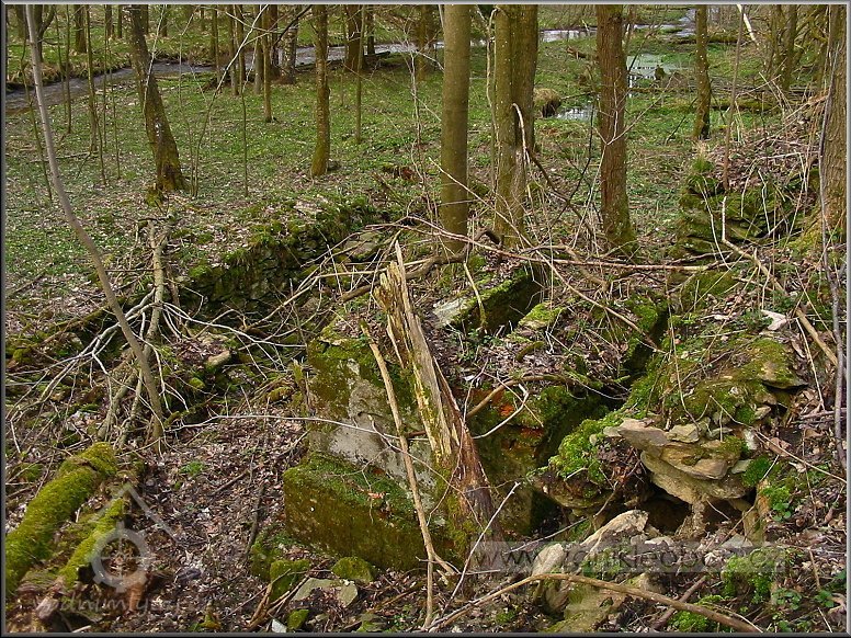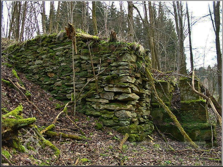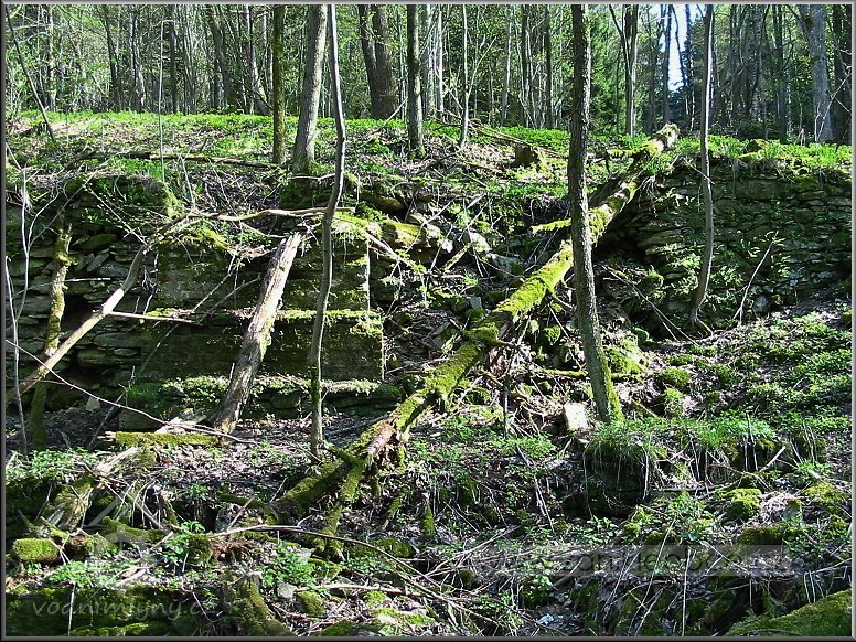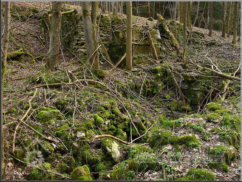 Pozůstatky hlavní mlýnské budovy pod zatáčkou cesty od Zadních Chalup ke Sv. Kateřině, 04 2011, © Petr Bílek
