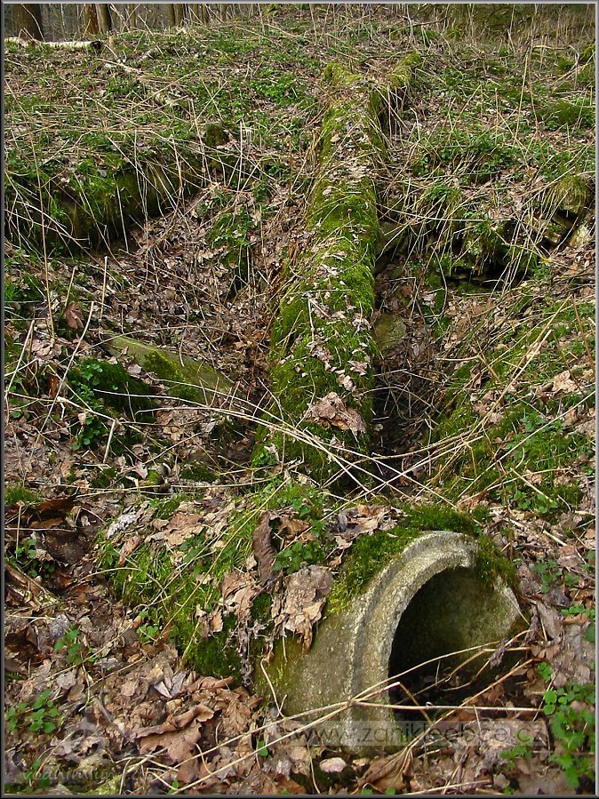 Pohled z vrchu na pozůstatky hlavní mlýnské budovy s vodní nádrží, kde se zřejmě otáčelo vodní kolo, 04 2011, © Petr Bílek, (Prvky na obrázku: náhon, lednice)