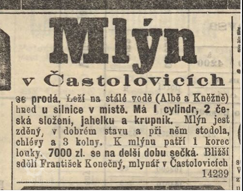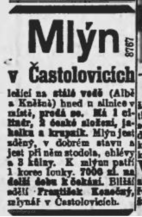 1738 vrchnost prodala mlýn Václavu Vilímkovi za 700 zl.