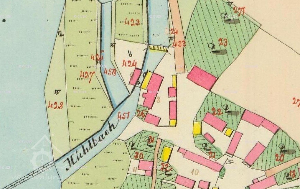 V r. 1930 vlastnili mlýn bratři Jahnigové. Č. p. je na skice 10, v Seznamu vodních děl 23.