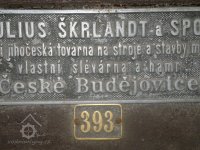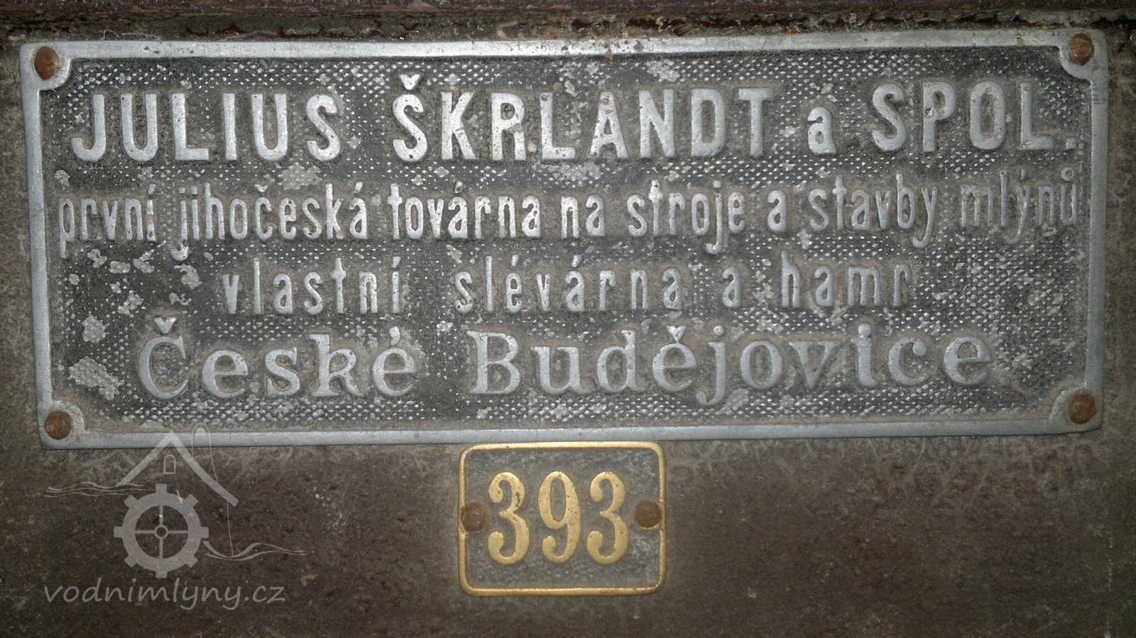 štítek mlecí stolice značky Julius Škrland, České Budějovice, 2011, © D. Veverka, (Prvky na obrázku: značka výrobce na technologickém vybavení)