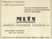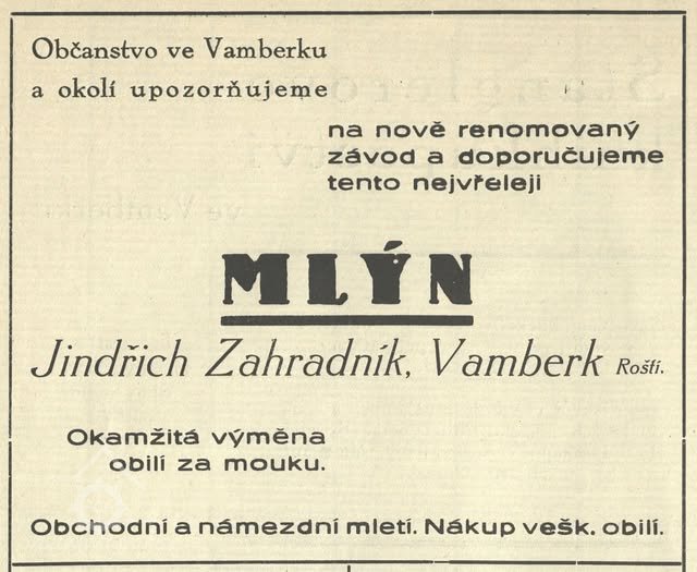1923 nástavbou a adaptací budovy vznikl mlýn, na podzim téhož roku zprovozněn.