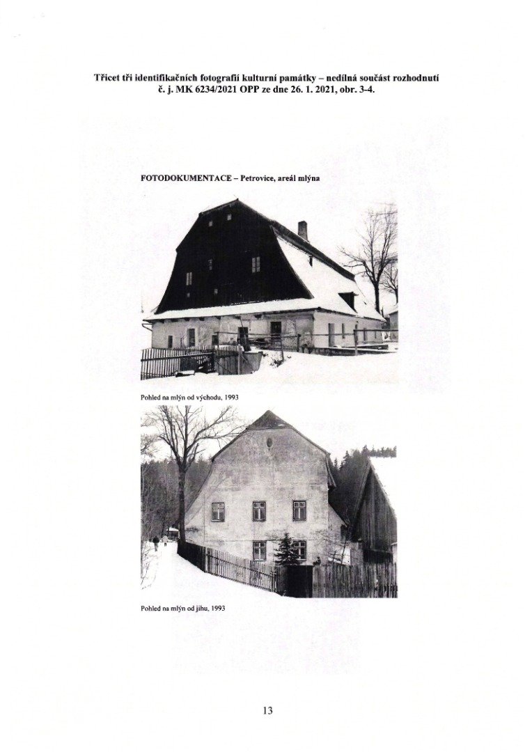 „[...] Na základě žádosti vlastníka, kterým je Společnost FJT Invest s.r.o., se sídlem Komenského 249, 66452 Sokolnice, si Vám dovolujeme poslat návrh na prohlášení věci za kulturní památku: areálu mlýna č. p. 16 (v rozsahu zákresu vytvořeného Národním památkovým ústavem, územním odborným pracovištěm v Telči) v k. ú. Petrovice u Nového Města na Moravě, Petrovice, obec Nové Město na Moravě, okres Žďár nad Sázavou, Kraj Vysočina.
