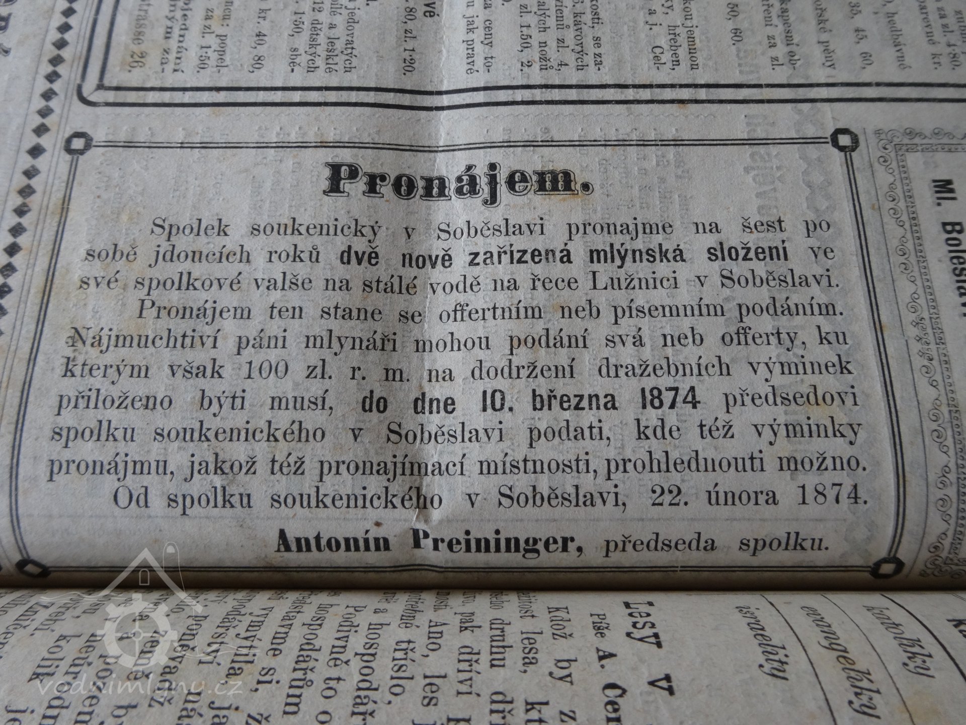 mezi Marii Zalabákovou, majitelkou mlýna na Valše čp. 2/II v Soběslavi a Juliusem a Boženou Nohejlovými z Bechyně čp.80, co kupujícími na prodej a koupi mlýna, zahrady, louky, cesty, pozemků a vybavení pokoje a kuchyně za trhovou cenu celkem 170 000,-Kč... kupující bere na vědomí, že pan Adolf Faltýnek, bývalý mlynář v Nových Mlýnech, pošta Moravičany, nyní dle udání v Jeřmani pp. Bouzov na Moravě měl s prodávající uzavřenou pachtovní smloubu z 16.12.1931 na dobu tří let, která skončila 31.12.1934. Adolf Faltýnek však nyní tvrdí, že pachtovní smlouva byla zrušena v srpnu 1932 a že prodávající přijala nového pachtýře pana Františka Steinochera, který odmítá mlýn vyklidit.