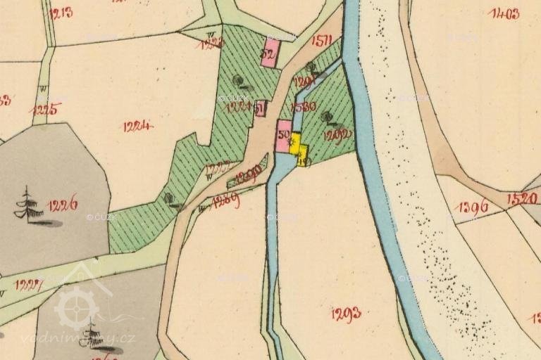 Pole a na loukách při mlýně, pod, nad a v rybníce od obou stran mlýnského potoka s pastvinou až k potoku Brzině a Chadimovým polím, na 3 vozy sena a 2 vozy otavy, tedy k nastoupení a plnému využívání za jednotnou kupní cenu šest set zlatých rýnských a to takovým způsobem, že