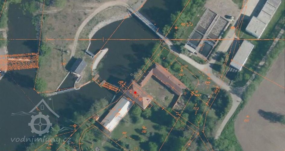 Řeka Lužnice dělí se před mlýnem na dvě ramena. V každém rameni jest pravidelný jez, kterým se voda nadržuje a žlabem na vodní kola vede. V levém rameni jsou kola pro povodňování, v pravém rameni jest mlýn založen. Zbytečná voda teče přes jez do řeky a též se průplavem jezu pravého ramene (jenom v září) pouští do řeky.