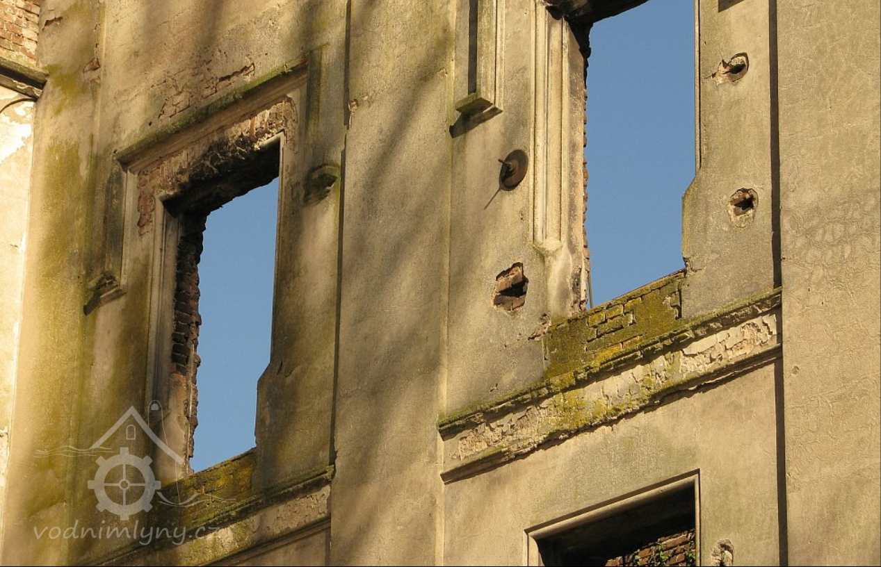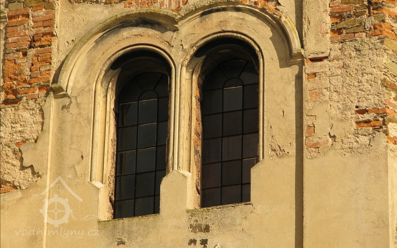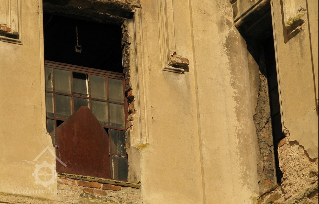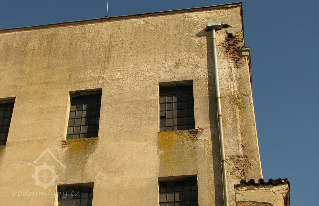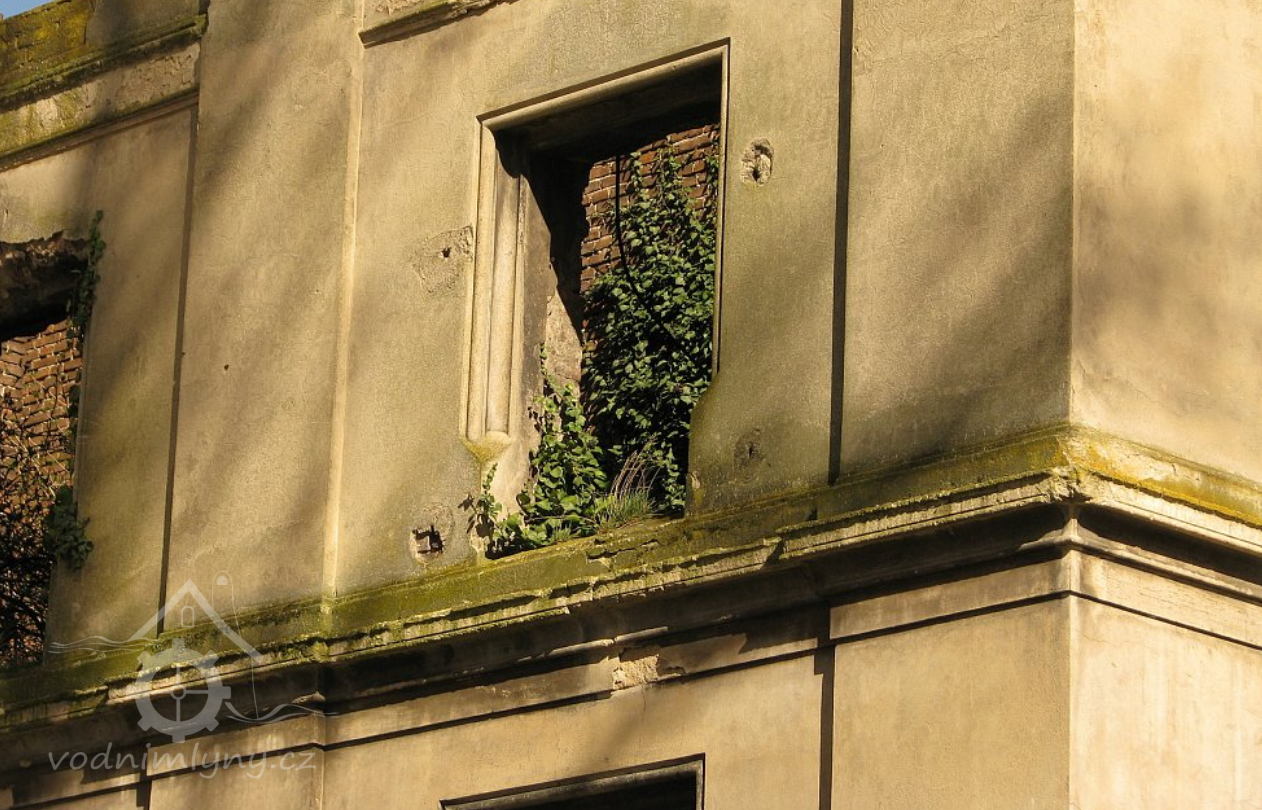 Pohled na mlýn, 02 2019, © Ivan Minář, (Prvky na obrázku: okno, plastická omítková výzdoba fasád a štítů)
