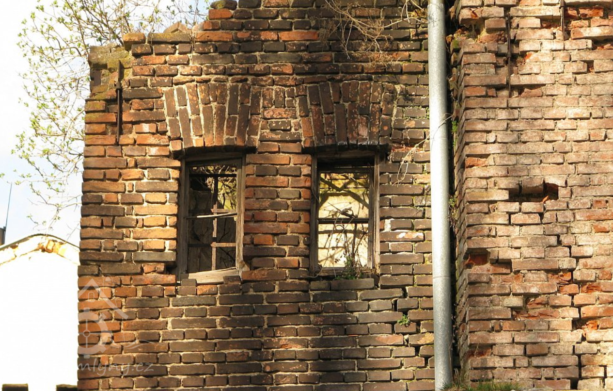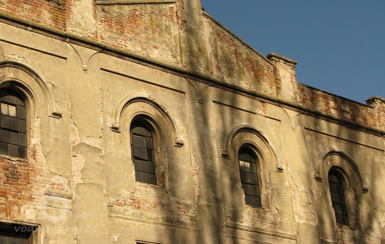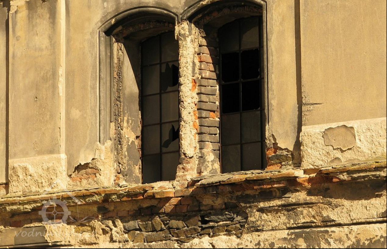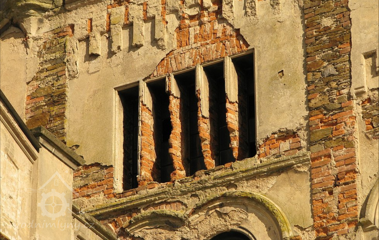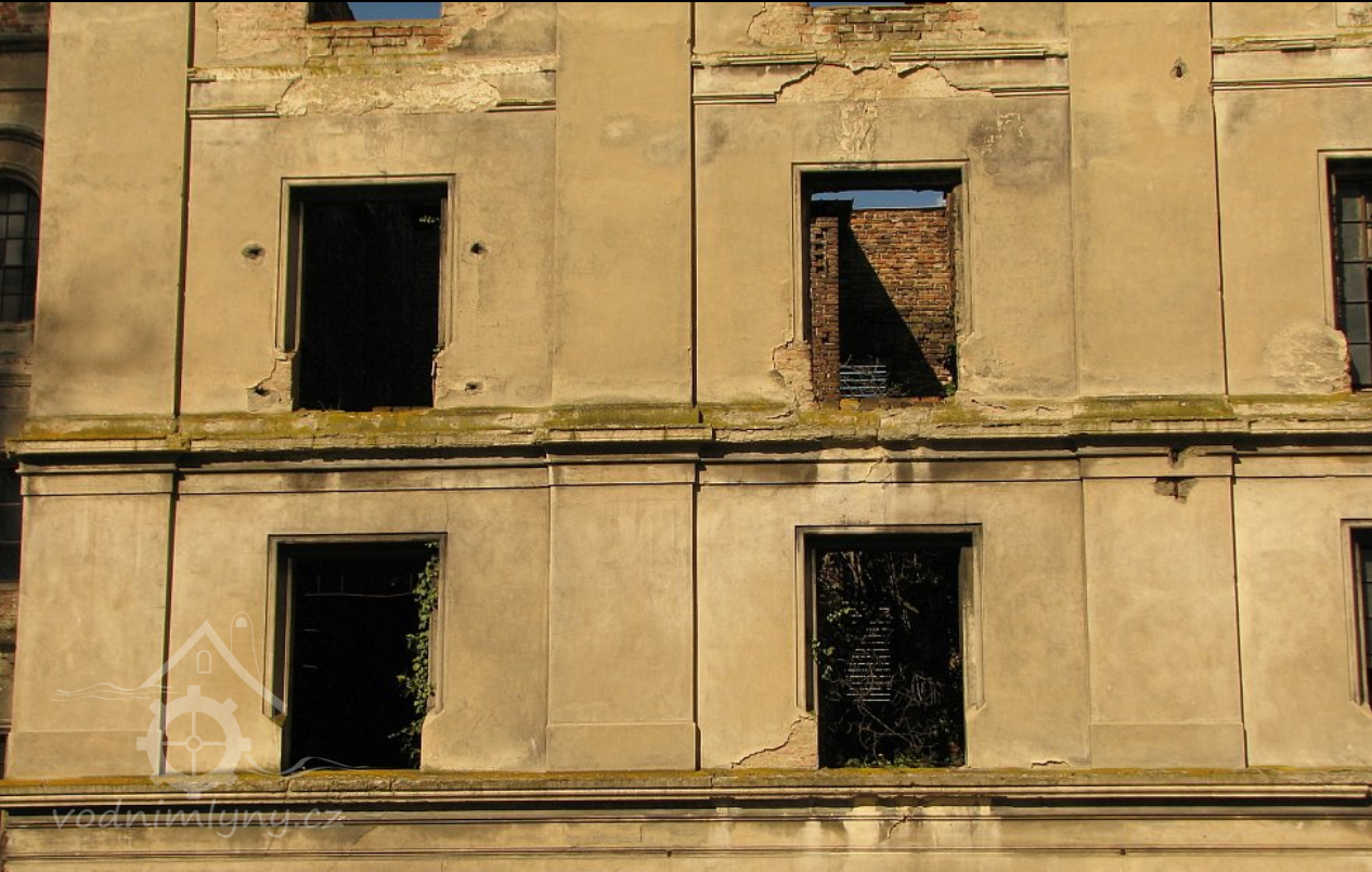 Pohled na mlýn, 02 2019, © Ivan Minář, (Prvky na obrázku: okno, plastická omítková výzdoba fasád a štítů)