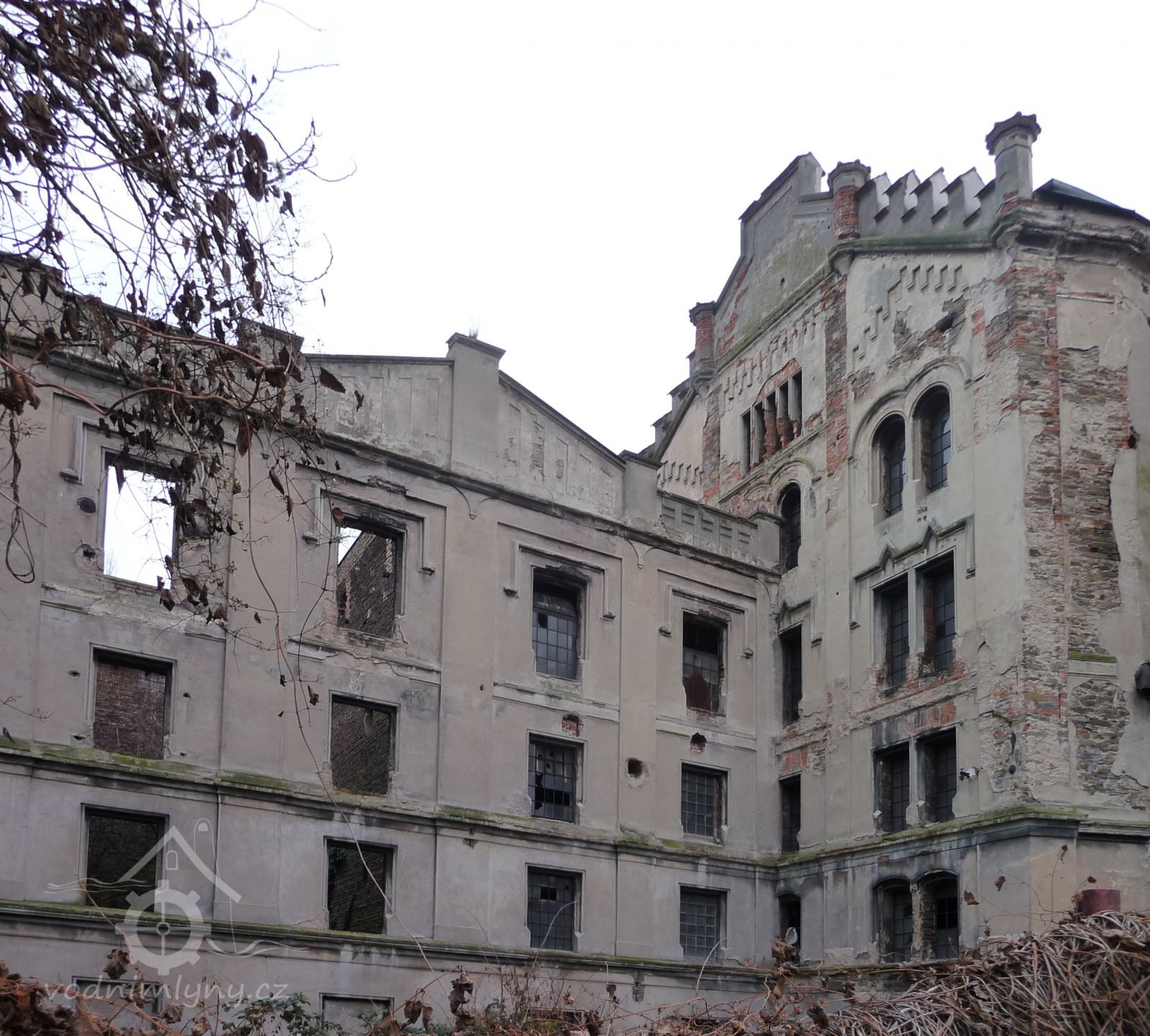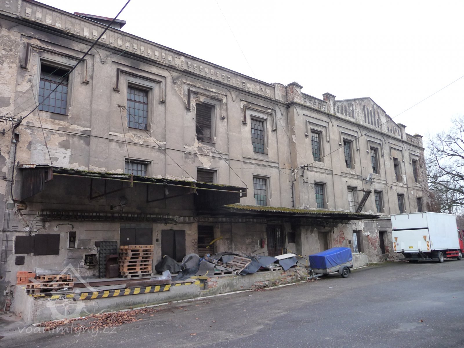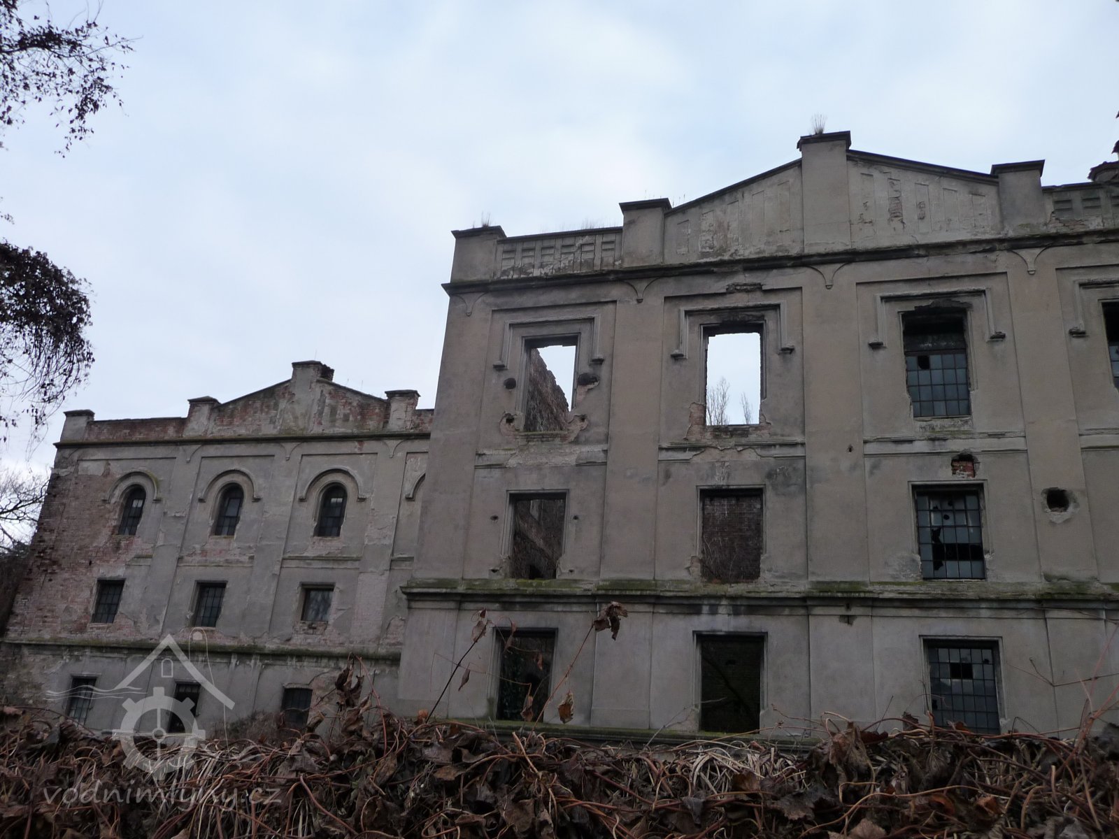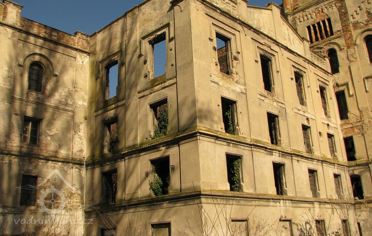 Pohled na mlýn, 02 2019, © Ivan Minář, (Prvky na obrázku: okno, plastická omítková výzdoba fasád a štítů)