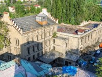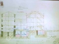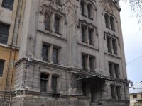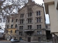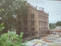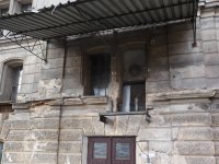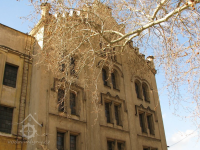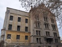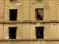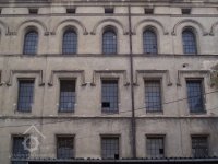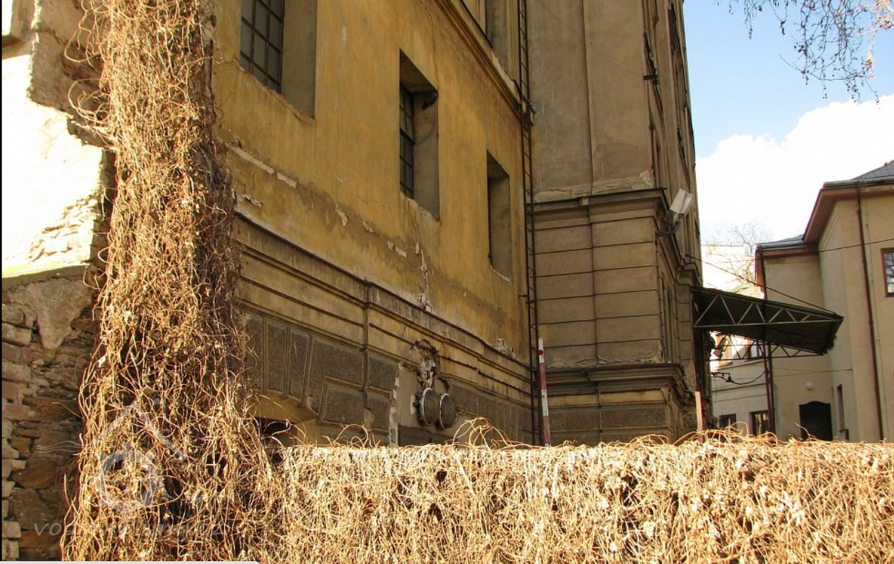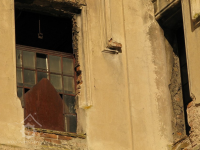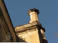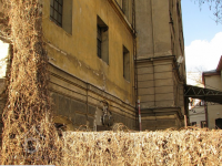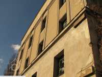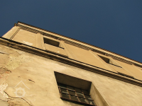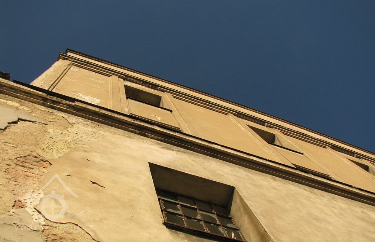 Plastická omítka a okna na boční stěně velké budovy - do dvora, 2014, © Helena Špůrová, (Prvky na obrázku: okno, plastická omítková výzdoba fasád a štítů, střešní nástavba)