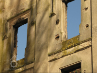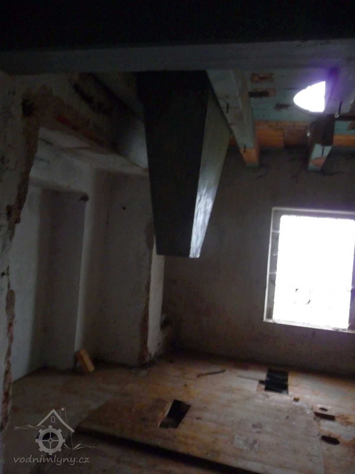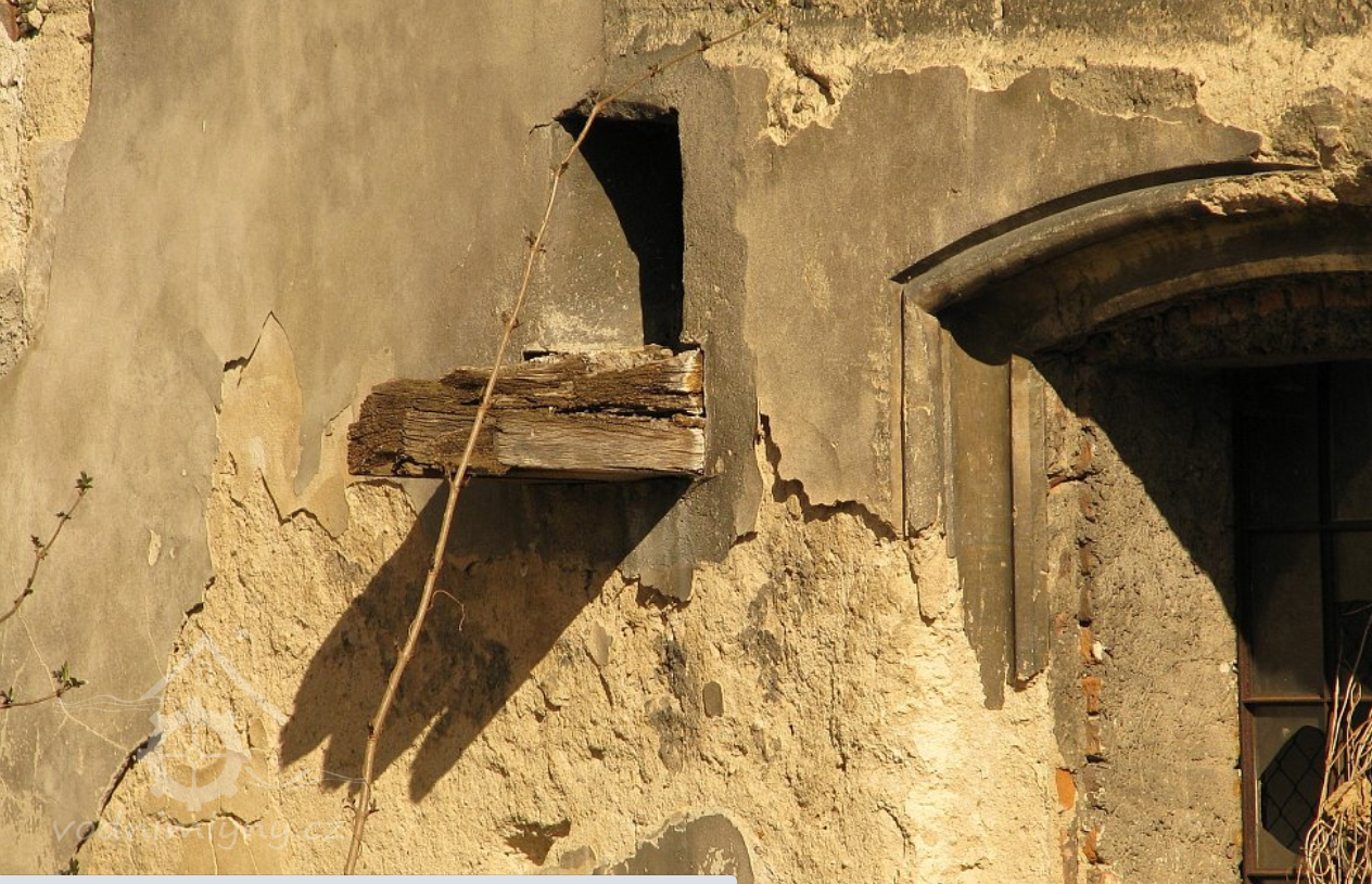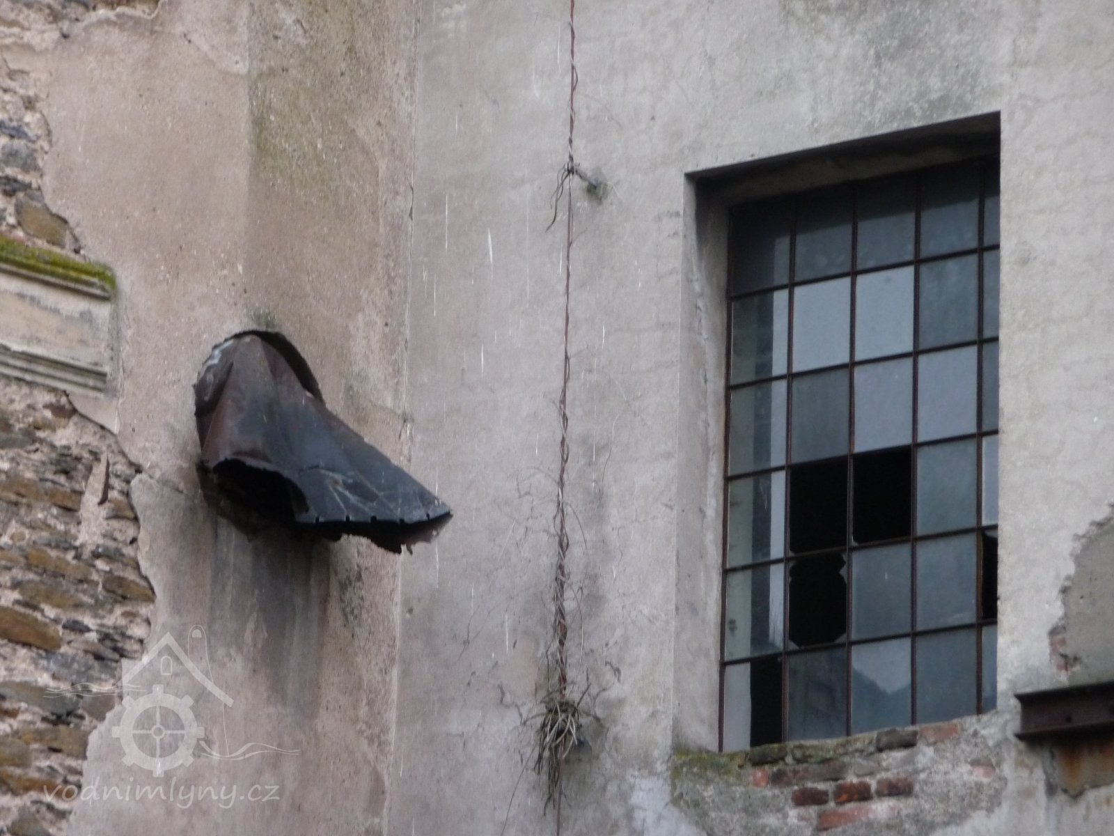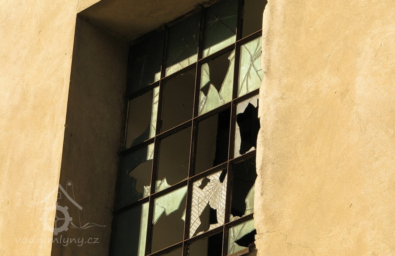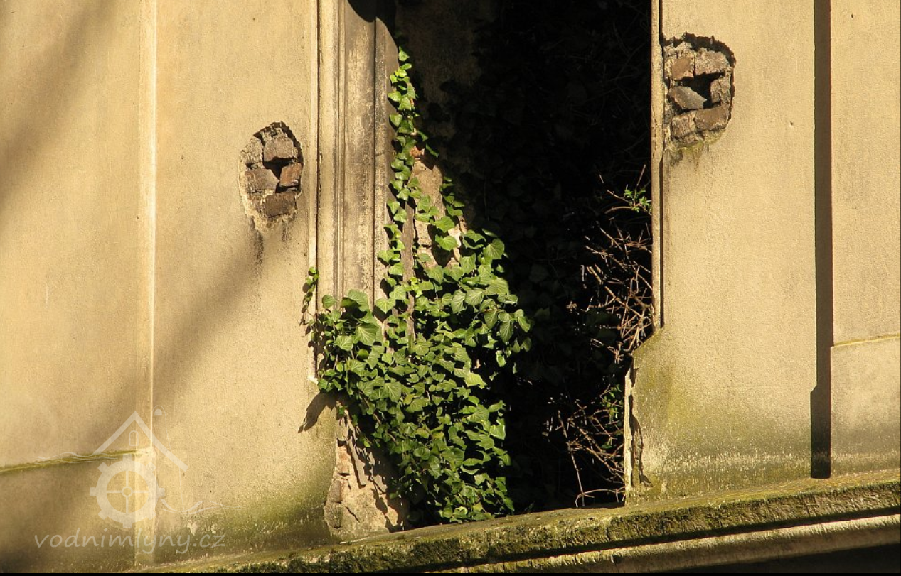 Pohled na mlýn, 2012, © Jaroslav Pejša, (Prvky na obrázku: okno, plastická omítková výzdoba fasád a štítů)