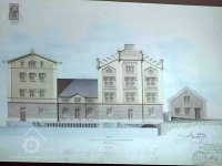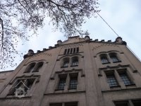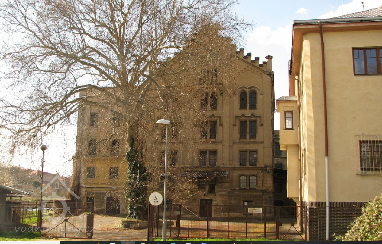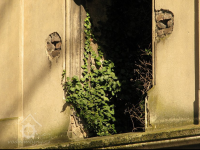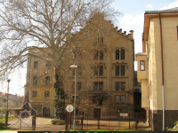 Plastická omítka a okna na budovách za velkou budovou, 2014, © Helena Špůrová, (Prvky na obrázku: okno, plastická omítková výzdoba fasád a štítů, zdobený zděný štít)