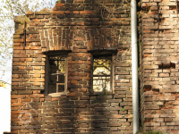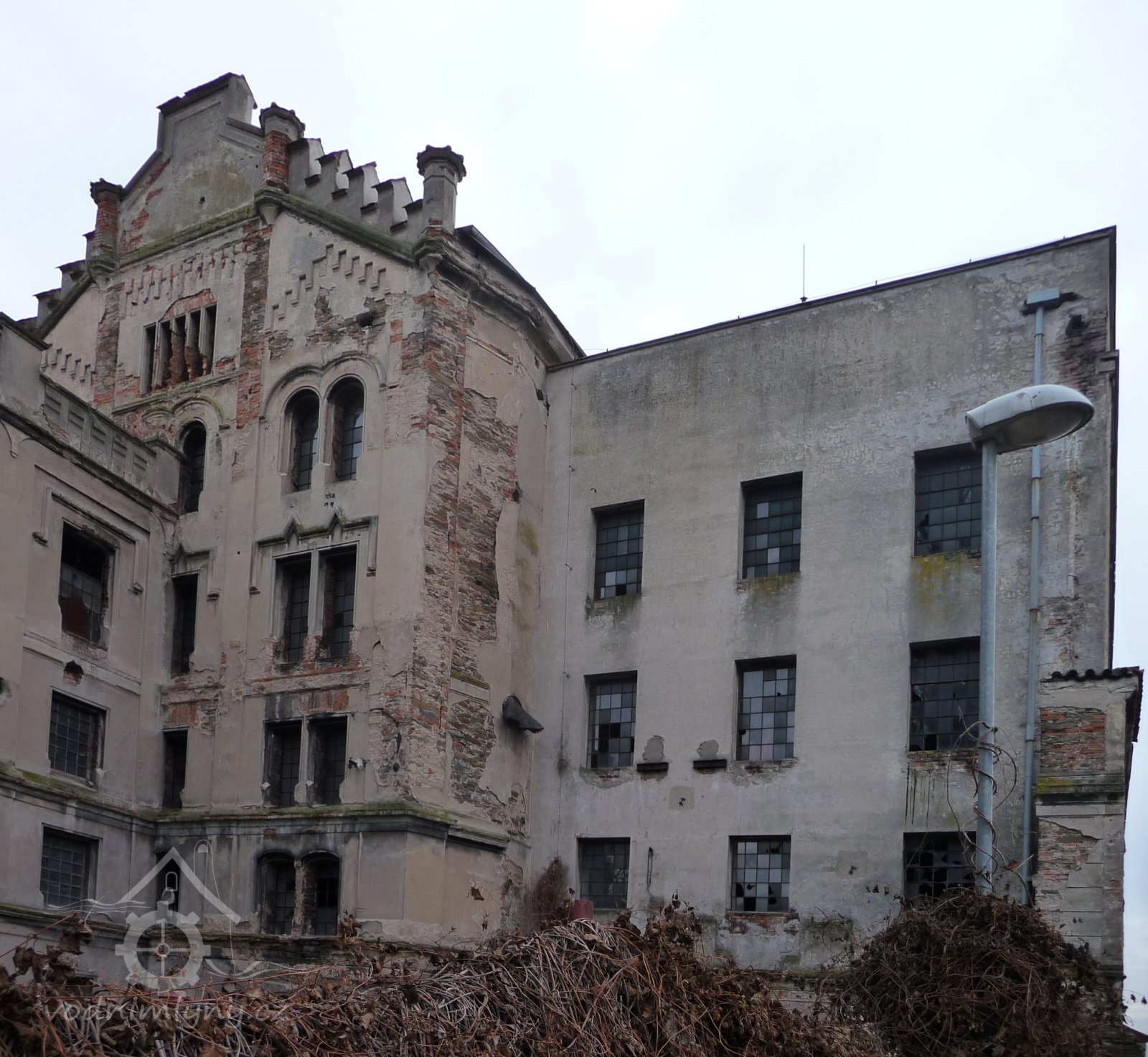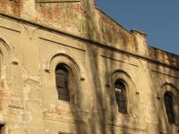 Plastická omítka a okna na štítě velké budovy mlýna, 2014, © Helena Špůrová, (Prvky na obrázku: okno, plastická omítková výzdoba fasád a štítů, zdobený zděný štít)