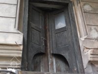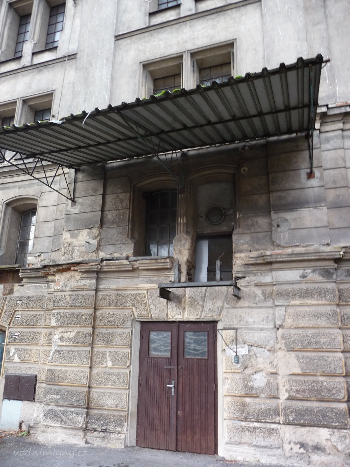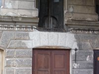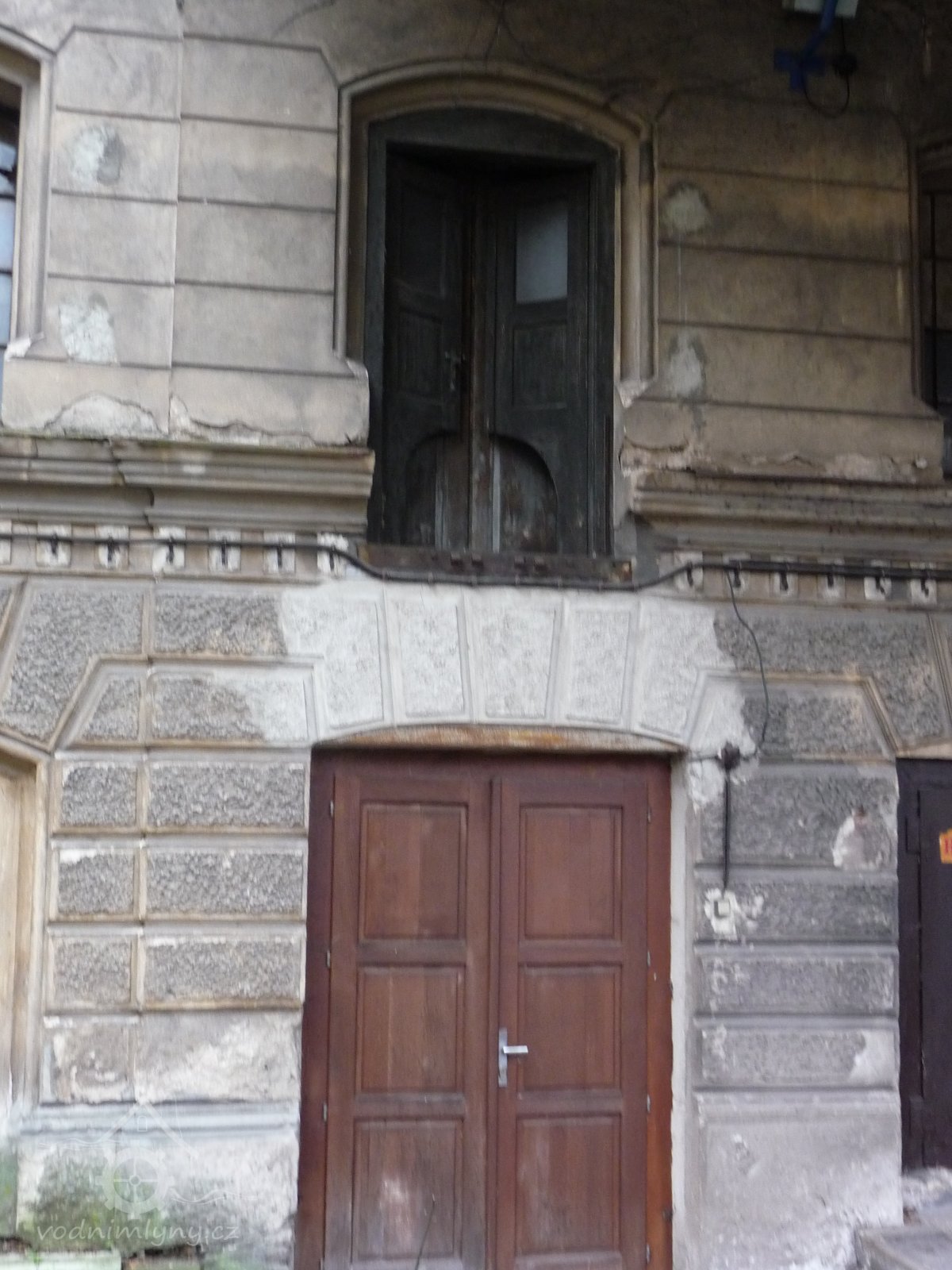 Dveře a vyskladňovací otvor - z čela budovy, 2014, © Helena Špůrová, (Prvky na obrázku: dveře, okno, plastická omítková výzdoba fasád a štítů, vyskladňovací otvor)