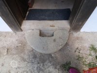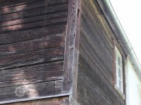 Zcela odlišné je levé nároží na úrovni přízemí, které je stejně jako přízemí zadního štítového průčelí rámové konstrukce, sroubená z trámců, s patrnými záseky po zasazení kolíčků na líci. Na levém nároží je ukončena do sloupku, na pravém konci je stěna shodně ukončena sloupkem, přisazeným k zalícovánému okraji zděné konstrukce. Spodní prahový trám je vyměněn.