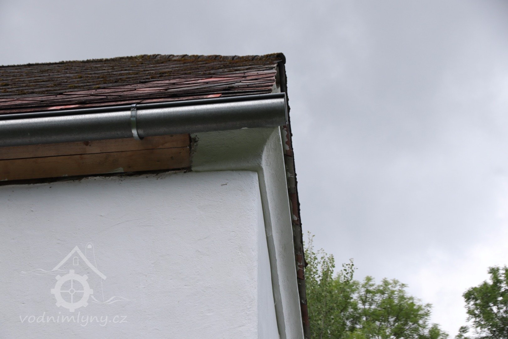 Shora je průčelí ukončeno lichoběžníkovým štítem polovalbové střechy. Štít je prostý svisle bedněný, s lištovanými spárami a dvojicí vyříznutých obdélníkových otvorů bez výplně. Před jihozápadní průčelí mlýna předstupuje šachta lednice. Je ze tří stran ohraničená kamenným lomovým zdivém s vyplavenou maltou, zčásti již rozpadlým. V jihozápadní stěně šachty je vyklenut segmentový záklenek odtokového kanálu. Vyšší severozápadní stěna lednice zasahuje do objemu tělesa hráze. Ze svahu vzdušného líce hráze vystupuje pěkný kamenný žulový tesaný žlab obdélníkového průřezu, s polodrážkou vysekanou na konci. Mlýnské kolo se nedochovalo, až na fragment hřídele.