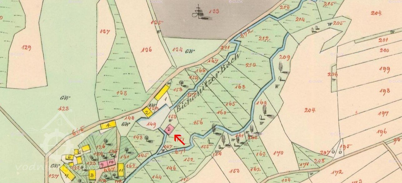 Rybník (akumulační nádržka) je situovaná mezi domem a stodolou. Má srpkovitý půdorys, o celkové délce cca 45m. Dle údajů starší plánové dokumentace dosahovala nádržka největší hloubky cca 85cm. Nádrž je lemovaná na jihozápadní, jižní a jihovýchodní straně sypanou hrázkou. Stavidla (čap) novodobé dřevěné konstrukce jsou situována na jižní straně nad bývalou lednicí. Na jihozápadní straně je kameny vyzděný bezpečnostní přeliv. Dle historické plánové dokumentace byla v hrázi osazena normálová značka. Voda je do akumulační nádrže přiváděn náhonem od severovýchodu, vedeným v přímém směru po úbočí mírného svahu údolí Bichanického potoka. V prostoru zahrady se dochovalo několik kamenných (žulových) nahrubo otesaných sloupků (kun) oplocení, s vysekanými otvory pro zasazení svlaků (rýglů) plotu.