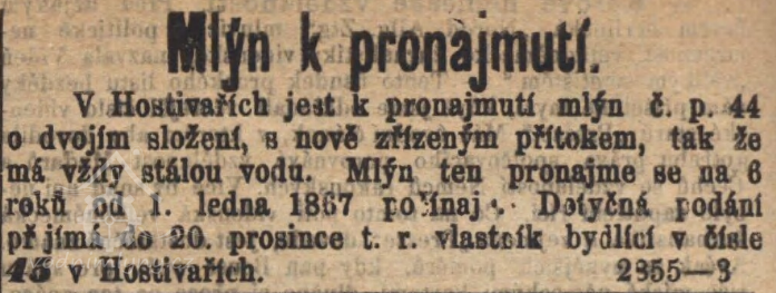 28.9.1866 mlýn o dvojím složení na stálé vodě s nově zřízeným přítokem k pronajmutí na 6 let (Národní listy)