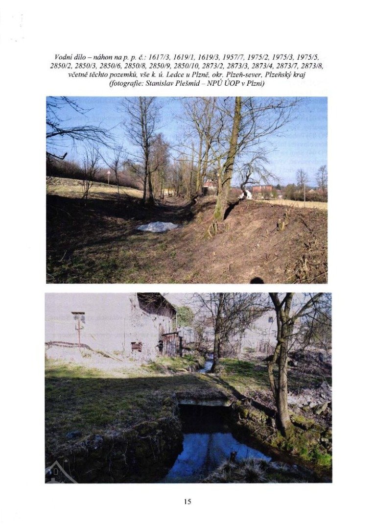 Voda k mlýnici byla přiváděna od jihozápadu náhonem napájeným z Třemošenského potoka. Ve 30. l. 20. stol. na konci náhonu úpravy z důvodu instalace turbíny, před stodolou uhýbá přepad a na místě zbyly betonové hranolové patky, na kterých stály dnes již zcela zaniklé vantroky. Ještě později, ve 40. I. 20. stol. byl náhon před mlýnici značně rozšířen na zásobní nádrž. Koryto náhonu se do dnešních dnů dochovalo v rozšířené podobě, kopírující průběh silnice Ledce - Příšov, směrem k Třemošenskému potoku patrný vysoký val; poměrně dobře dochované koryto náhonu bylo v posledních letech zásluhou stávajícího vlastníka vyčištěno a zbaveno náletové vegetace. Náhon je přerušen pod rybníkem, ze kterého dnes vytéká Třemošenský potok. Prostor bývalé lednice je dnes otevřený a na betonové desce přepažující hloubku lednice stojí Francisova turbína. Odpad je pod bývalou lednicí částečně vedený pod terénem, při výtoku vidět vrchol kamenné valené klenby, na jejímž rubu je násyp tvořený zatravněnou zeminou, voda je dále odváděna směrem k návsi otevřeným korytem, jehož boční stěny jsou částečně vyzděny z větších hrubě opracovaných kamenů. Do koryta odpadu se u jihovýchodního nároží stodoly napojuje i přepad náhonu. Odpad směřuje dále k východu otevřeným korytem podél bývalého chléva do sousedních zahrad, u zahrady domu čp. 36 je vedený pod zemí, vyúsťuje v blízkosti silnice a pokračuje otevřeným silně zarostlým korytem na náves, do míst pod areálem zdejší fary.