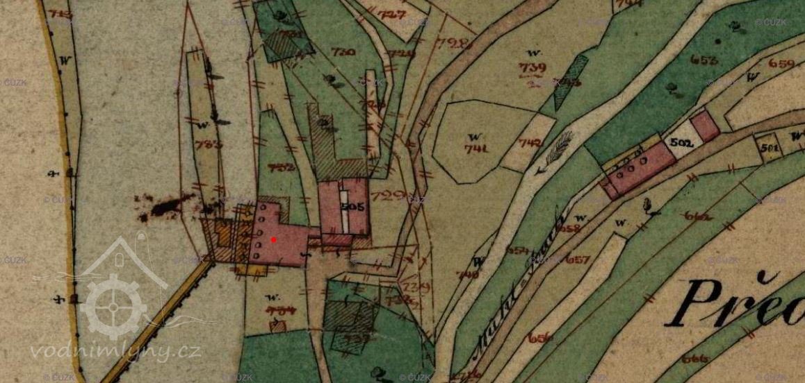 Popis1930: 2 kola na spodní vodu, hltnost 6,454 m3/s, spád 1,5 m, výkon 42,6 HP