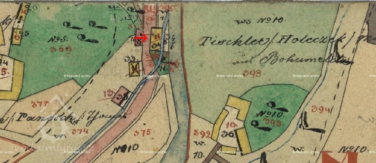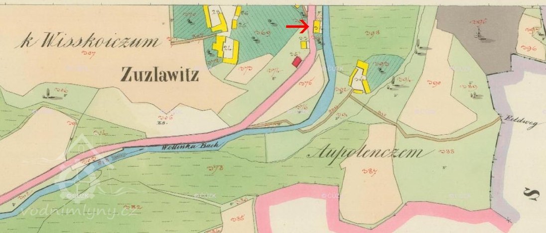 Mlýn nejspíš získal vodní pohon až po roce 1837. Náhon je zakreslen na Indikační skice, ale na Císařském otisku chybí.