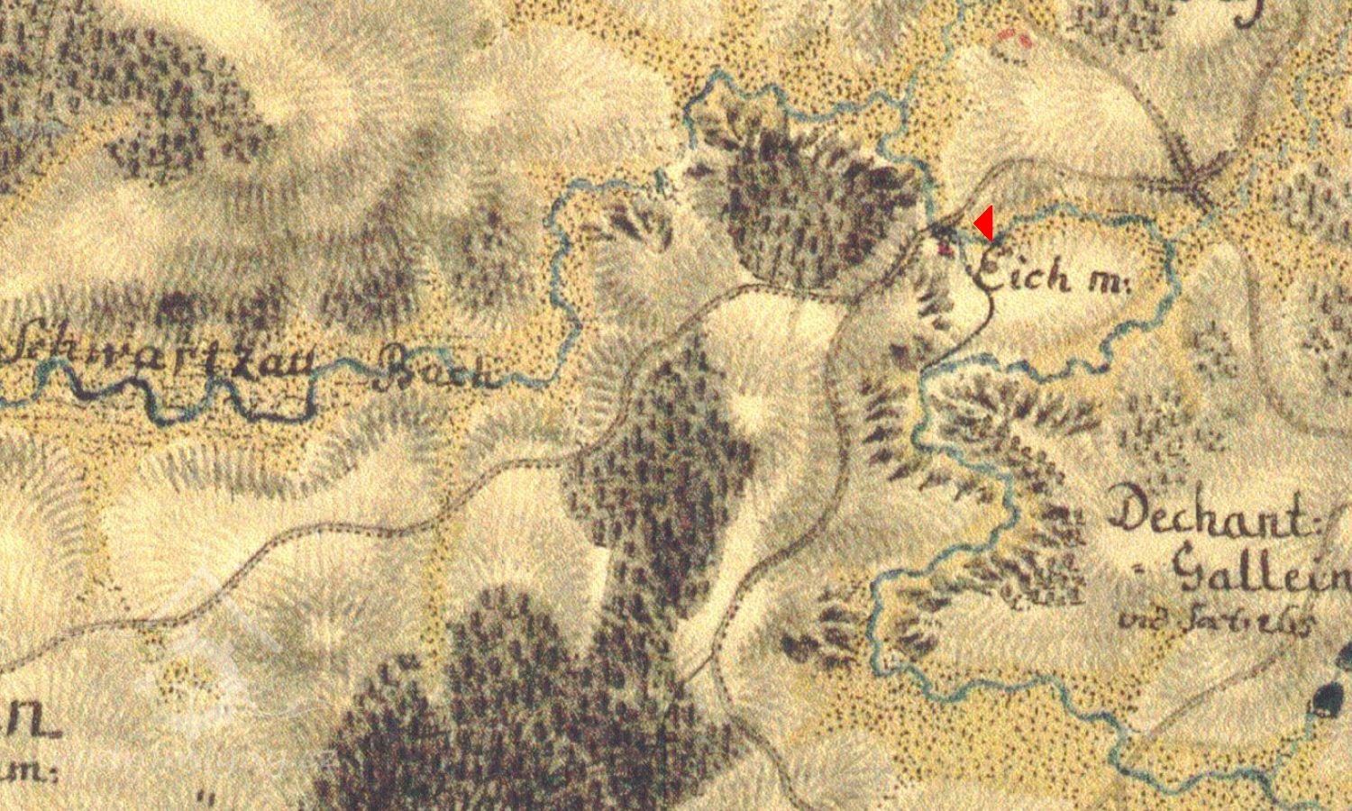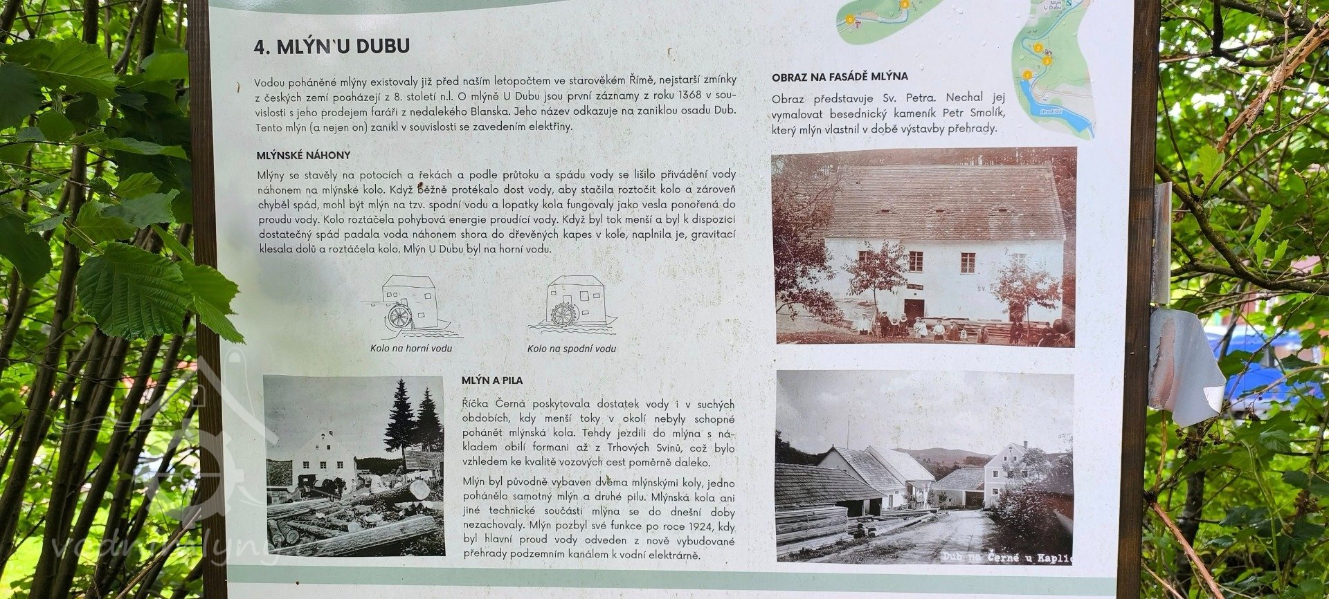 Mlýn na říčce Černé dříve Eich muehle, nebo Aich muehle je poprvé připomínán už roku 1368, kdy ho Jan z Dobré Vody prodal faráři z Blanska. Nárok na mlýn si v roce 1591 prosadil Vilém z Rožmberka. Provoz mlýna se zastavil v roce 1924, kdy byla většina vody odvedena do nedaleké elektrárny. Poslední majitel Petr Smolík nechal na hlavní budově vytvořit malbu zobrazující svatého Petra.