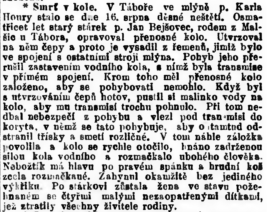 16. srpna 1886 zahynul při opravě kola stárek Jan Bejšovec. (RR)