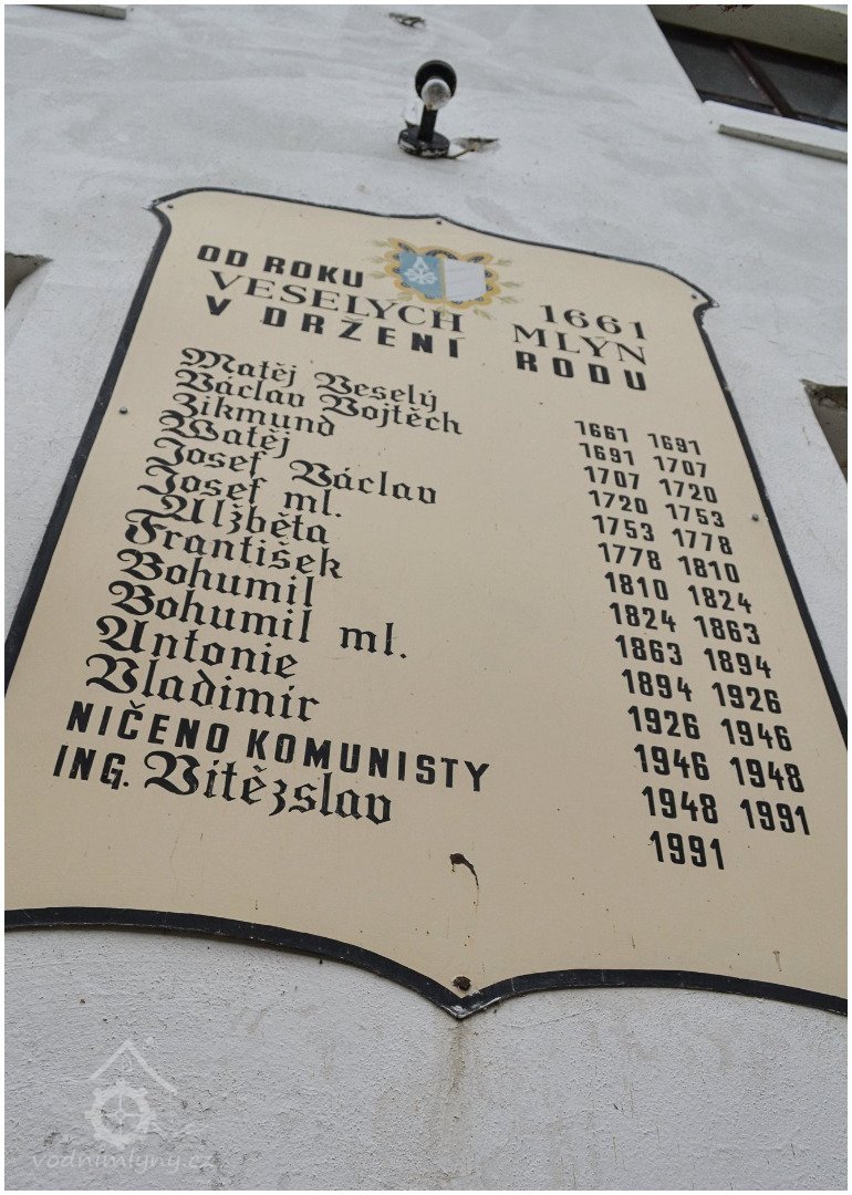 Rodina Veselých mlýn vlastnila od roku 1863 do roku 1946. V roce 1991 byl mlýn rodině Veselých navrácen v restituci.