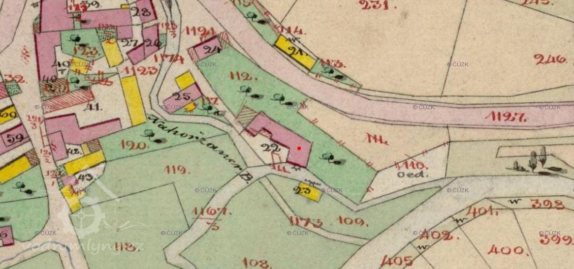 PopisV roce 1930 poháněla mlýn 2 kola na svrchní vodu, průtok 0,3 m3/s, spád 2,6 m, výkon 8,5 a 3,5 HP