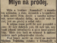 V r. 1880, za majitele Václava Tvarůžka, byl mlýn s hostincem nabízen k prodeji. (RR)