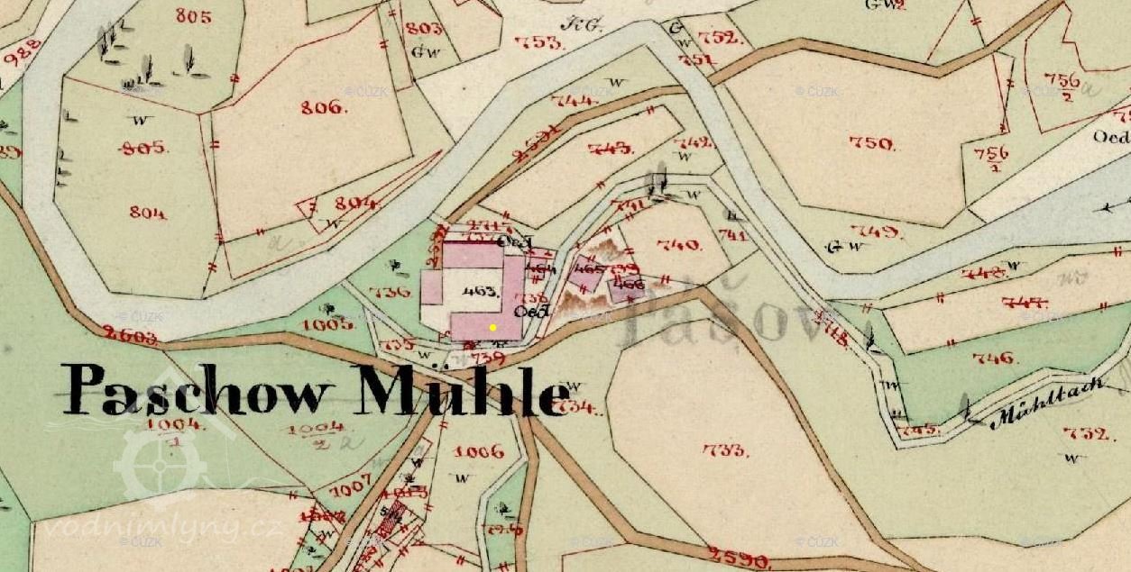 Kdy byl postaven Hořejší mlýn není známo. Vůbec první záznam o něm je v Archivu českém z 23. února 1407. Hořejší mlýn nebo též Drahonický, který byl nazvaný podle Petra Drahonického a počátkem 17. století nazvaný Paškovský mlýn (též mlýn Pášov).