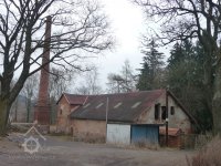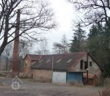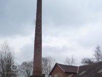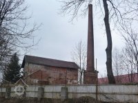 Bývalá škrobárna je jednopatrová s vysokým továrním komínem.