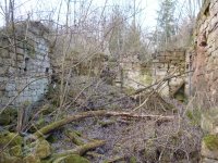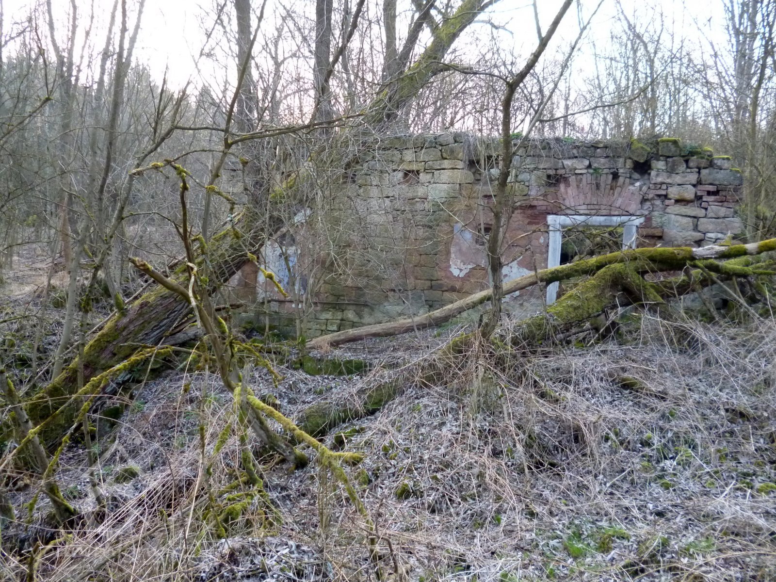 V rozbořených zdech jsou vidět klenuté sklepy, otvory po dveřích.