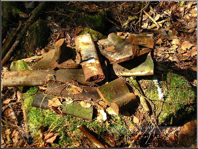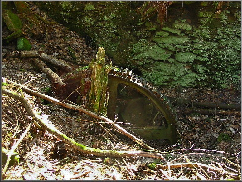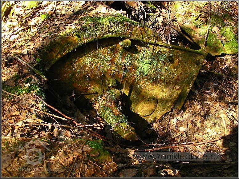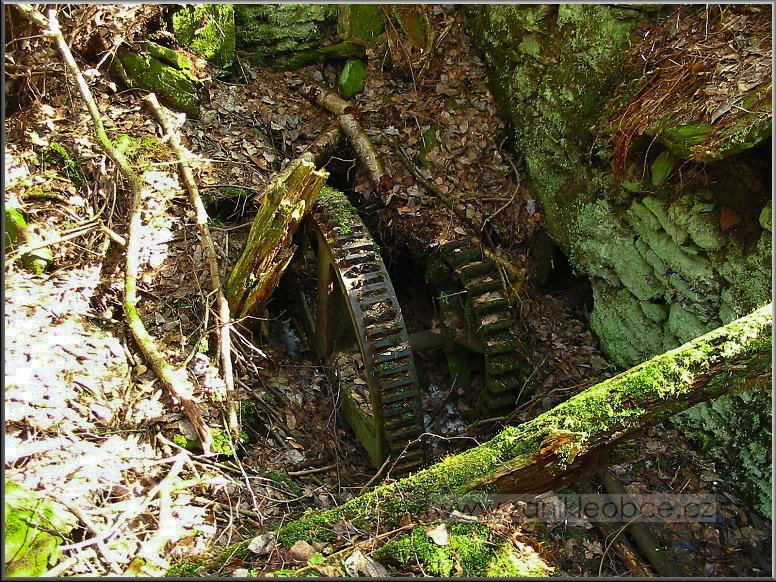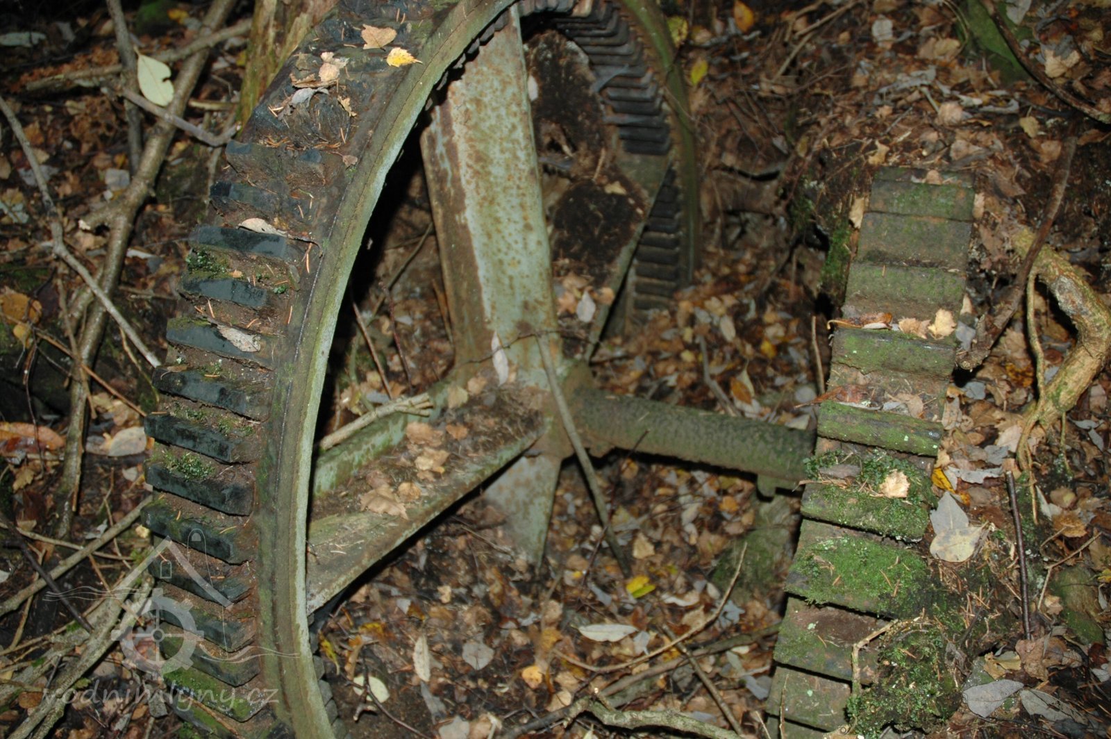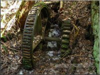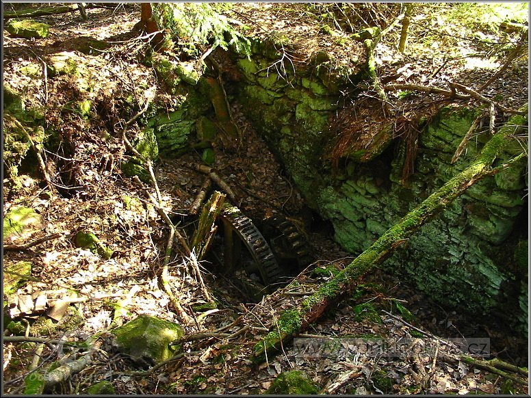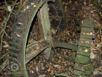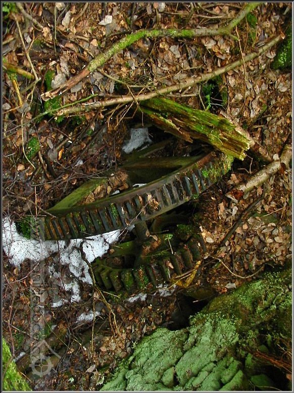 VDalší technický pozůstatek hnací jednotky mlýna, který byl v létě r. 2012 nepochopitelně ukraden, jak a kým je otázka?!, 03 2012, © Petr Bílek, (Prvky na obrázku: transmise, řemenice, převody - ozubená kola, pastorky (průmyslový výrobek))