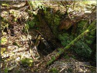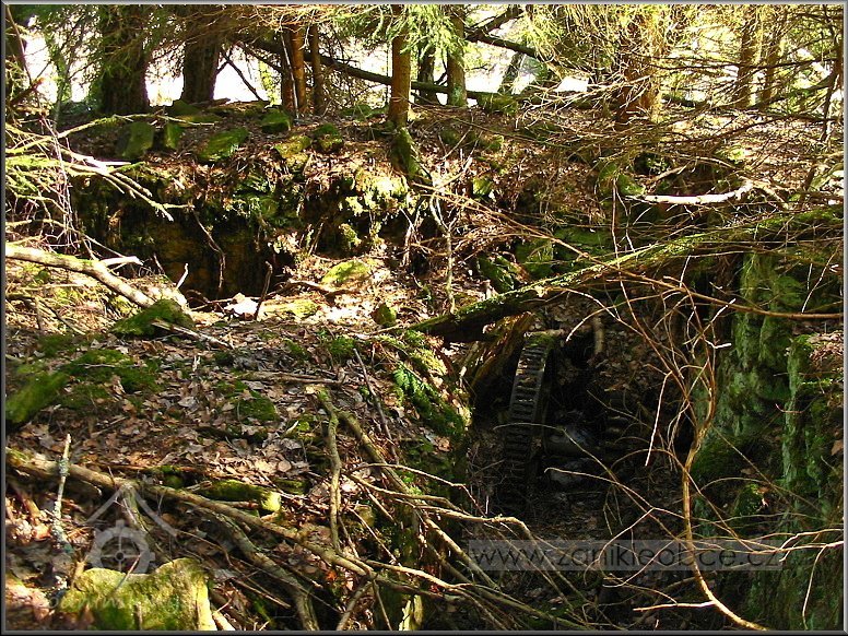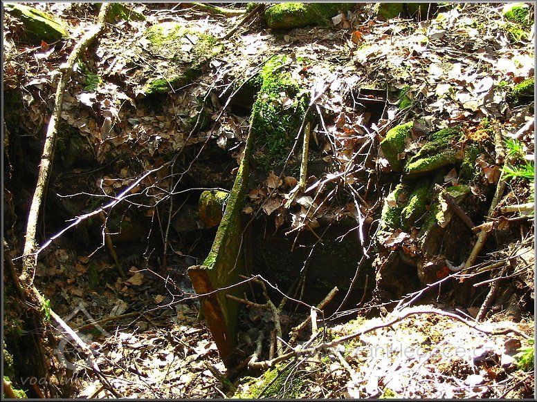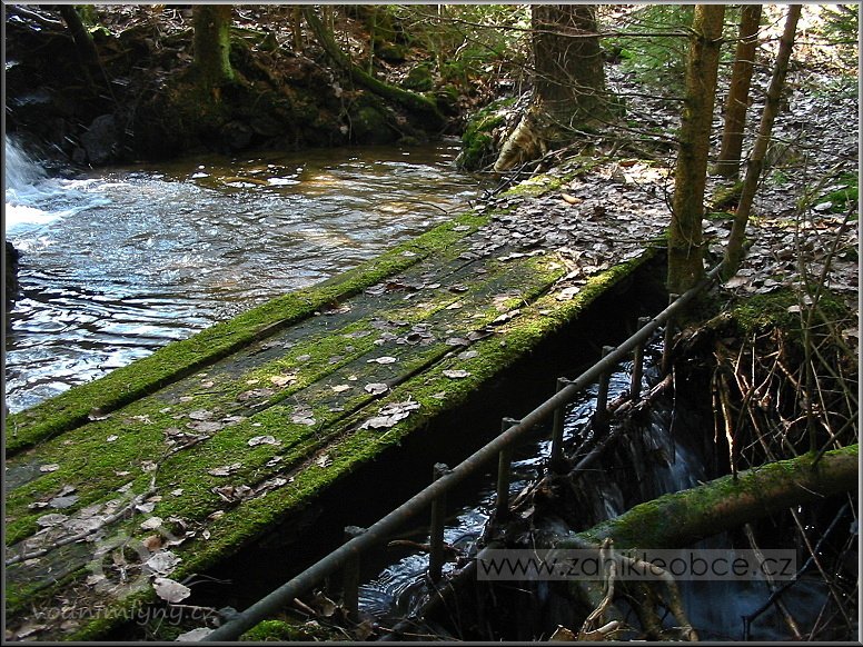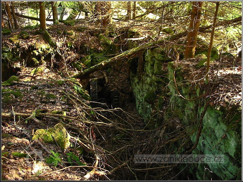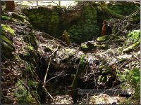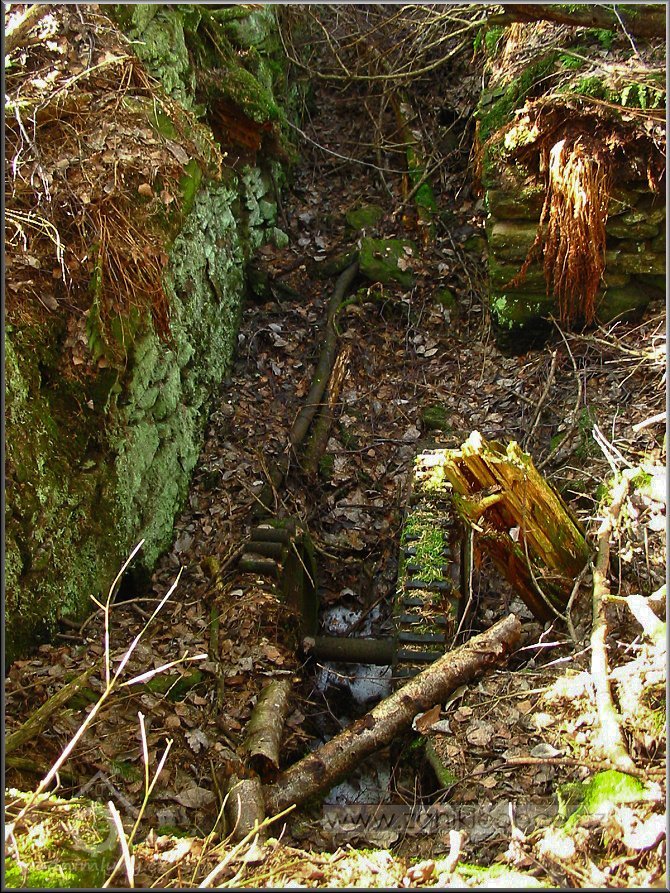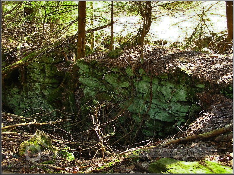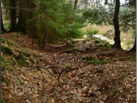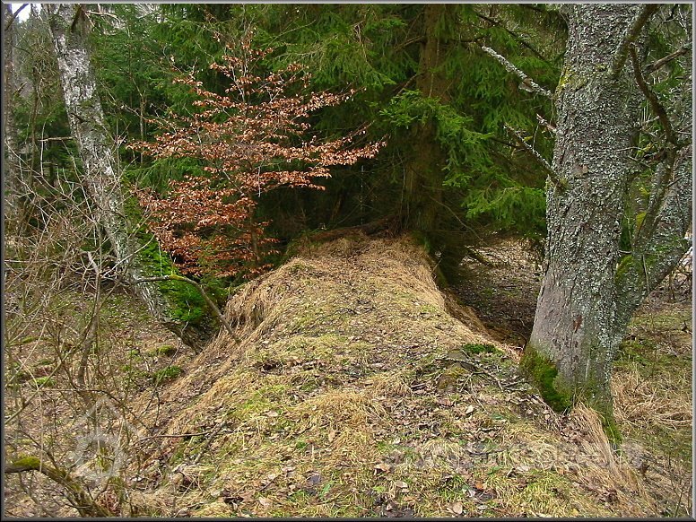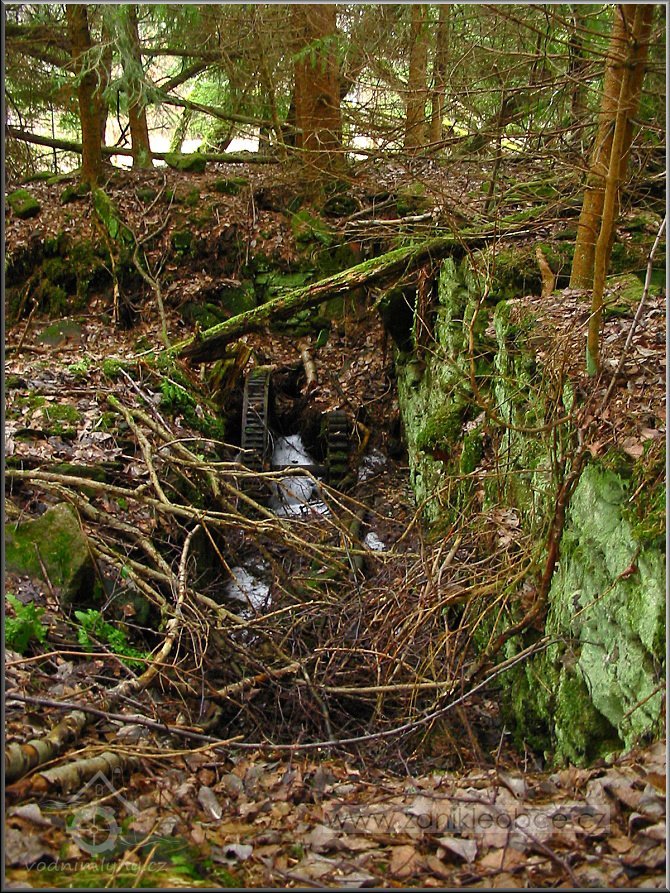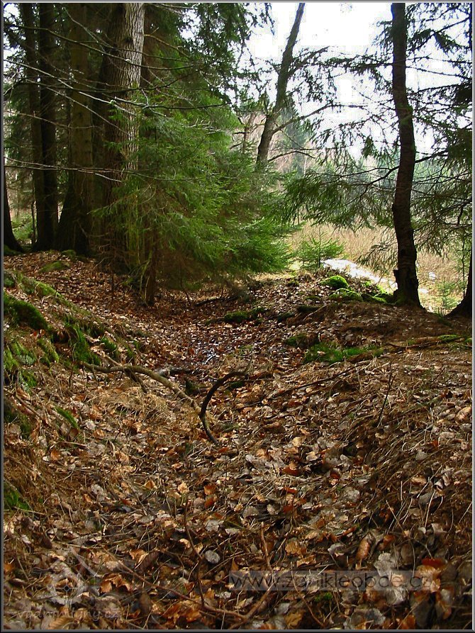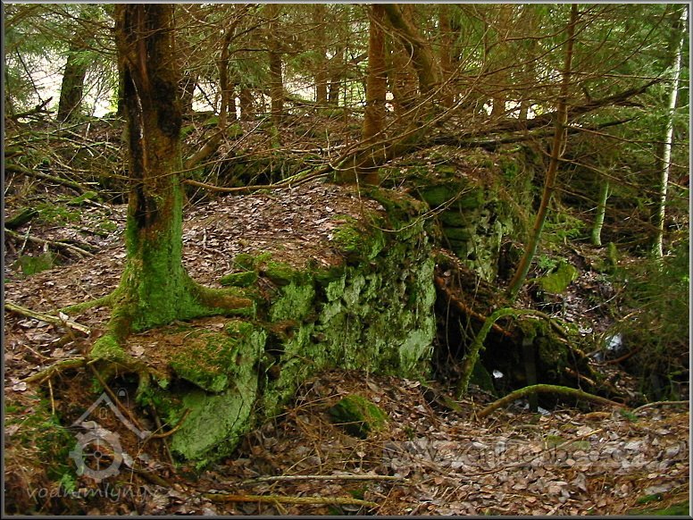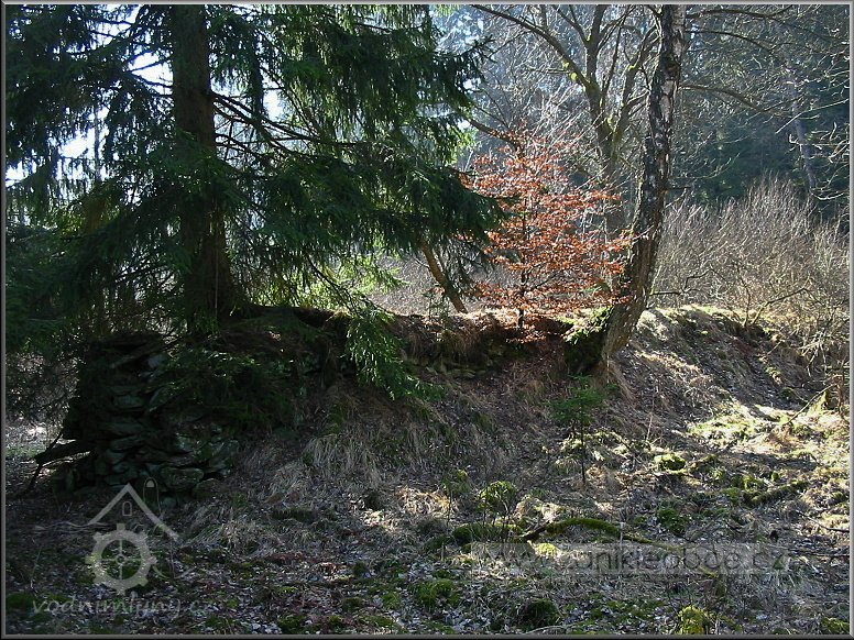 Násep, po kterém vedl náhon přivádějící vodu na mlýnské kolo. Vpředu mezi smrky se nacházejí velmi zarostlé a ukryté ruiny mlýna včetně ozubené hřídele a dalších pozůstatků mlýnských mechanismů, 03 2012, © Petr Bílek, (Prvky na obrázku: vantroky)