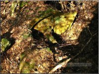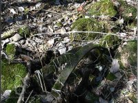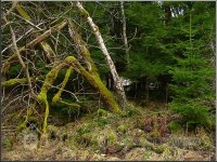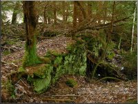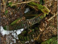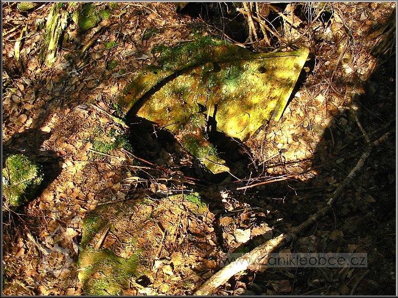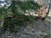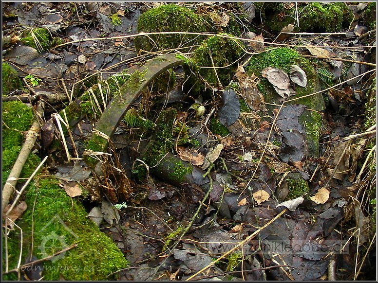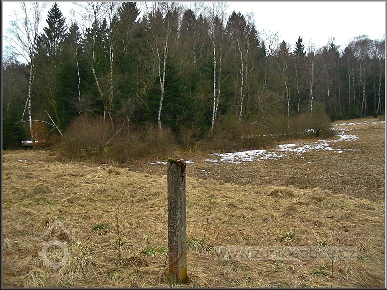 Sloupek od plotu na bývalé zahradě u mlýna, jehož velmi zarostlé ruiny se nacházejí vpředu mezi břízami a smrky, 03 2012, © Petr Bílek