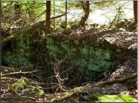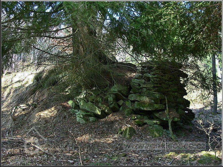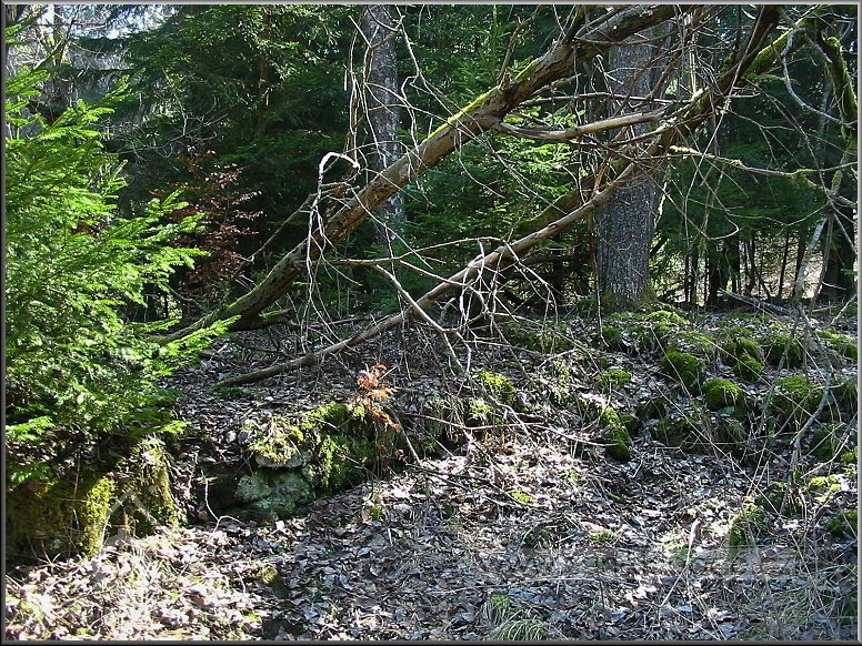 Pozůstatky sutin a základů vedlejší mlýnské budovy, vpředu mezi smrky se nacházejí ruiny mlýna, 03 2012, © Petr Bílek