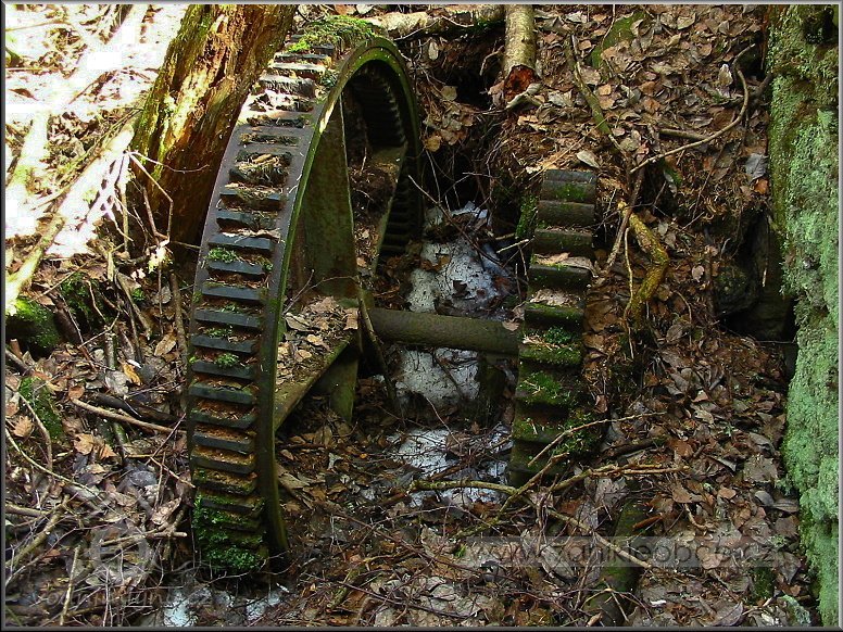mlýn a další zmizelý pozůstatek, 03 2012, © Petr Bílek, (Prvky na obrázku: transmise, řemenice, převody - ozubená kola, pastorky (průmyslový výrobek))