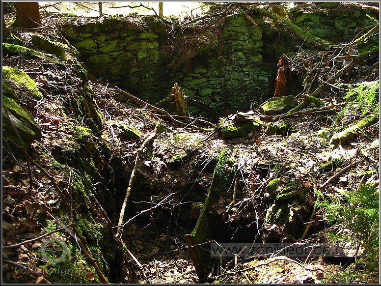 Ruiny hlavní mlýnské budovy jsou ukryty mezi stromy, vpravo je vodní šachta, kde se otáčelo mlýnské kolo a kde byl náhon, 03 2012, © Petr Bílek, (Prvky na obrázku: lednice)