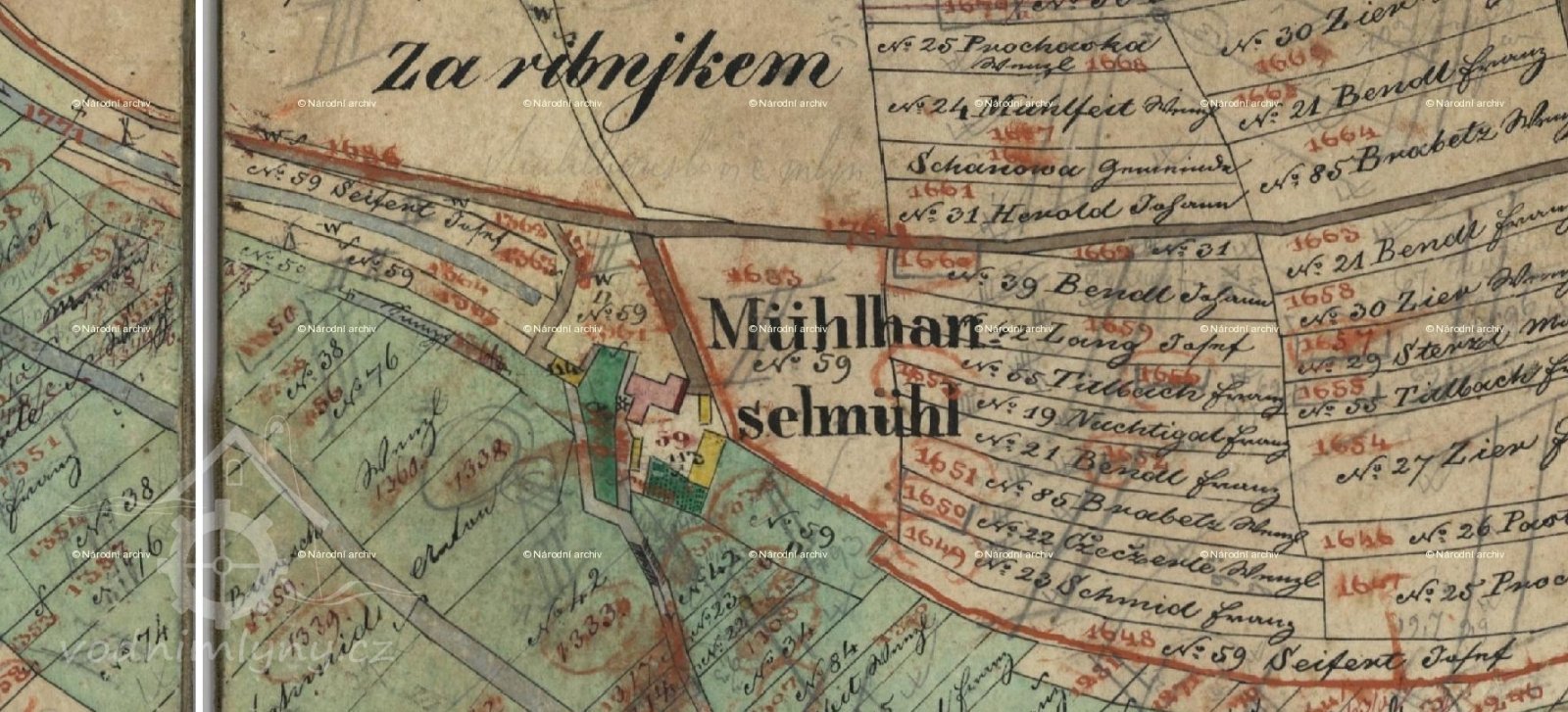 Od poloviny 18. století se v písemnostech objevuje jméno mlynáře Jakuba Saiferta. Po Jakubovi pak převzal mlynářské řemeslo jeho syn Josef Saifert, *4.4.1780. Ve stabilním katastru v r. 1841 je ještě uváděn jako vlastník mlýna - č. 59 Josef Saifert, ale již v říjnu téhož roku se zde narodil František, syn Jiřího Hnitky mlynáře ze Šanova. Ten byl synem Jana Hnitky, mlynáře z Tuchlovic a Marie roz. Liprtová ze Senomat.