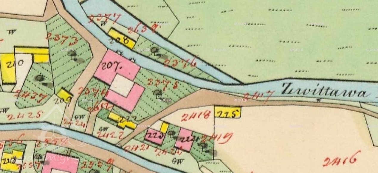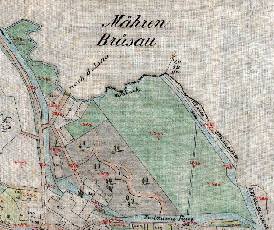 Firmě Daubek majetkově náleží pouze hraniční potok, jehož hořejší část byla dávno již zasypána a s loukou spojena. Tento potok s táhl lukami, podél kůlny a stodoly dále napříč loukou až ke dráze. Jehož severní část leží na území obce Březová a jeho jižní část na území Brnněnce. Potokem tímto se voda propouští při opravách jezu, nebo stavidel mlýna čp 6 v Brněnci. V části koryta tohoto potůčku vedla kdysi původní zemská hranice Čech a Moravy.
