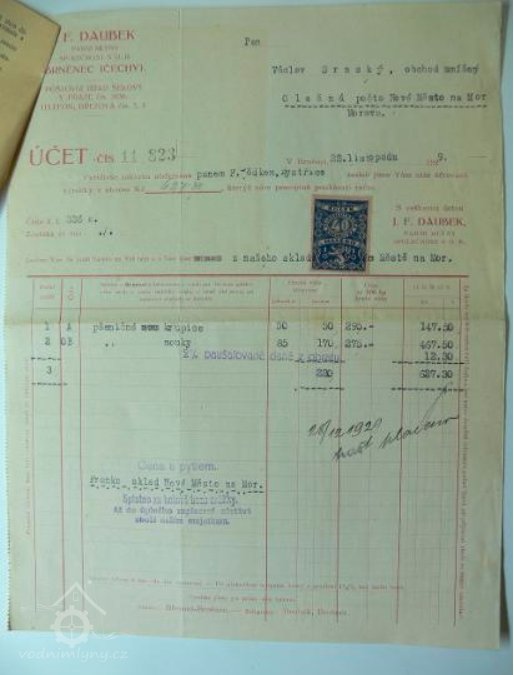 Z kupní smlouvy na mlýn čp 6. i s přilehlými pozemky a ostatními budovami, ze dne 26. 1. 1854, která byla uzavřena mezi kupujícím J. F. Daubkem, průmyslníkem z Poličky a prodávajícím Antonínem a Annou Fischerových za cenu 25. 250 zlatých tehdejší konvenční měny.