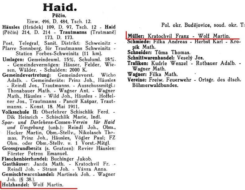 Podle německé verze adresáře prý byl Wolf ještě tzv. "Holzhandel", tedy obchodník se dřevem. Je proto možné, že u mlýna čp. 1/2 byla zároveň i malá pila.