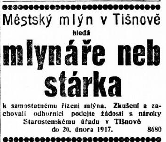 Vdova Františka mlýn provozuje do října 1907, kdy ho prodává městské obci tišnovské s veškerým příslušenstvím, pozemky, návsí, zahradou , loukou i pastvou a právy k tomuto mlýnu příslušejícími. Zejména právem na potahování vody z řeky Švarcavy a udržování jezu či splavu k pohánění na mlýn potřebné vody. I po tom, co mlýn již patřil městu, říkalo se mu jabůrkův mlýn. (Šimíček)