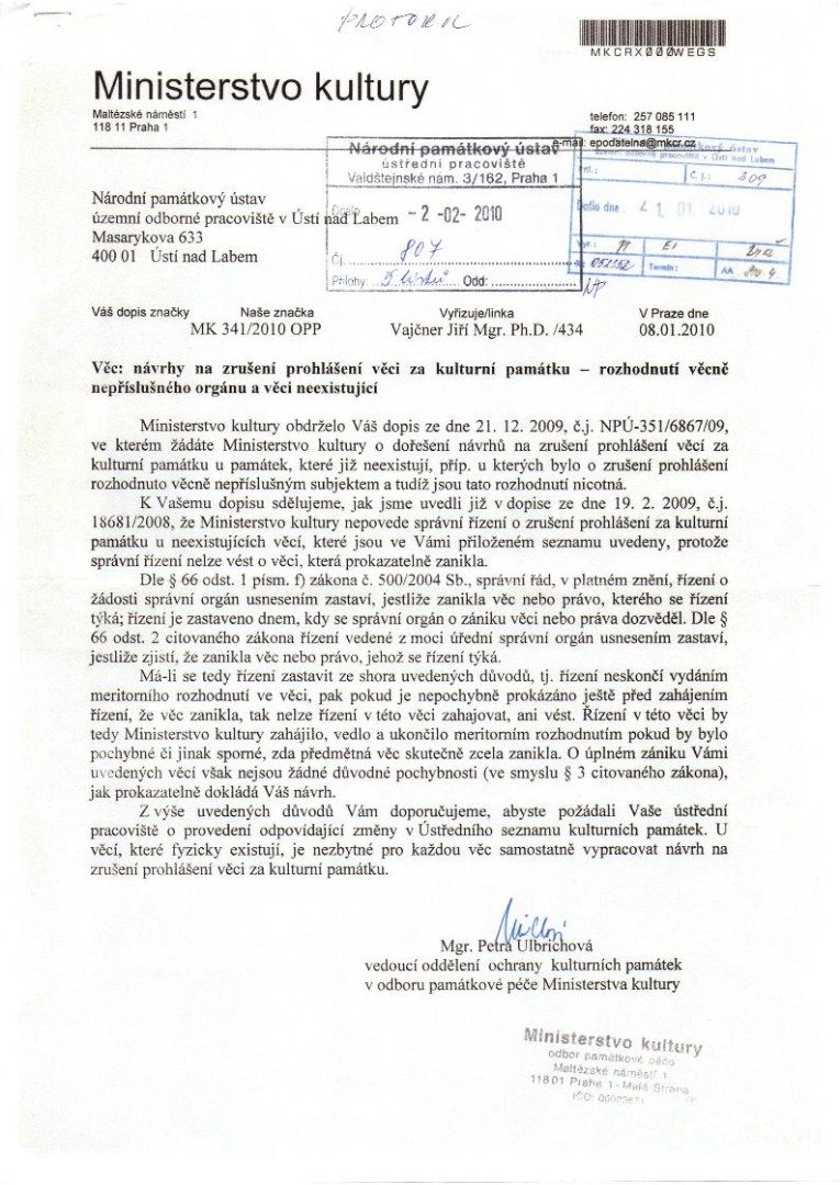 Národní památkový ústav, územní odborné pracoviště v Ústí nad Labem oznamuje odboru evidence a dokumentace - oddělení evidence nemovitých kulturních památek odboru evidence a dokumentace generálního ředitelství Národního památkového ústavu v Praze za účelem opravy údajů v ústředním seznamu kulturních památek ČR, že objekt, identifikovaný dle zápisu jako kulturní památka rejstříkové číslo 54006/5-1072 - mlýn - zanikl. Usedlost stála na pozemku s číslem parcely 31 (viz přiložené mapy).