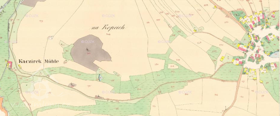 1673 Kačer z dědiny Vídně, syn Tomáše Kačera prodává k záduší kostela sv. Marka v Mostišti louku, kterou 1626 koupil Tomáš Kačer