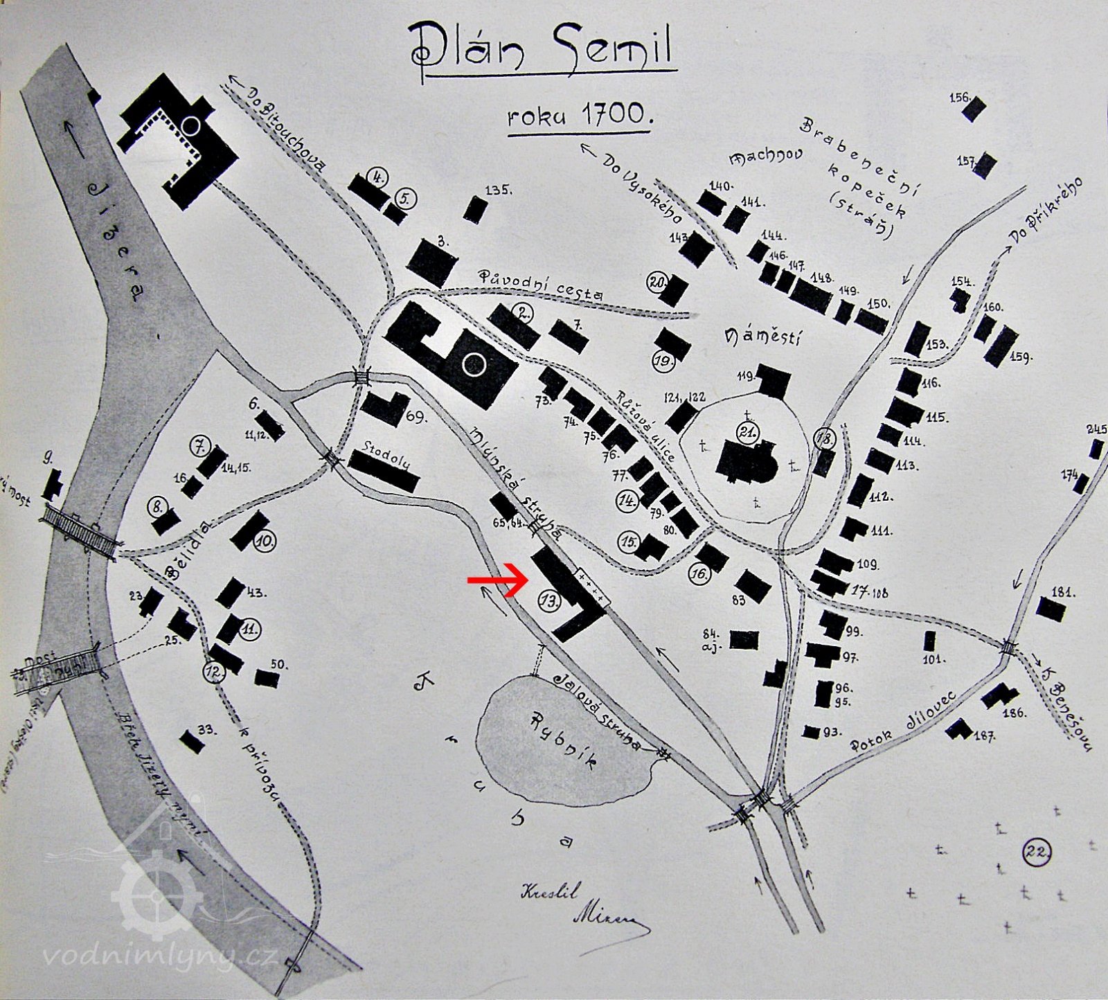1690 mlýn o 5 složeních s pilou a olejnou emfyteuticky zakoupil Jan Meyvaldt (+1706) i s rybníkem Na Kruhách. Odprodal vrchnosti za 150 kop gr. míš. pozemek na stavbu radnice (1702 postavena dřevěná)