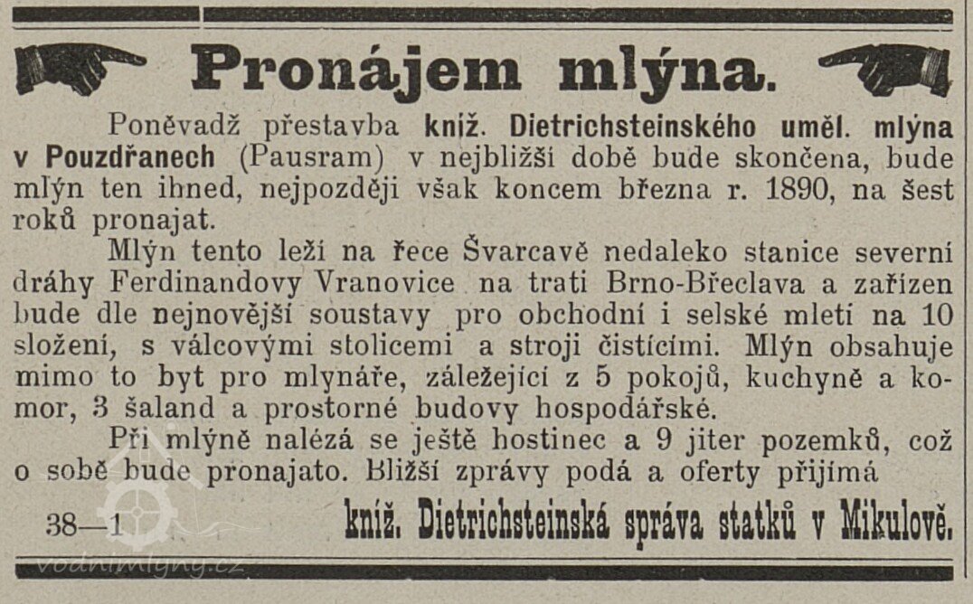 Mlýn průmyslového charakteru stojí na severním okraji Pouzdřan v mírné zatáčce silnice směrem na Vranovice.